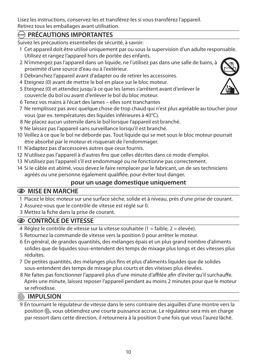 PRÉCAUTIONS IMPORTANTES Suivez les précautions essentielles de sécurité, à savoir: 1 Cet appareil doit être utilisé uniquement par ou sous la supervision d'un adulte responsable. Utilisez et rangez l'appareil hors de portée des enfants. 2 N'immergez pas l'appareil dans un liquide, ne l'utilisez pas dans une salle de bains, à & proximité d'une source d'eau ou à l'extérieur. (XL 3 Débranchez l'appareil avant d'adapter ou de retirer les accessoires. 4 Eteignez (0) avant de mettre le bol en place sur le bloc moteur. 5 Eteignez (0) et attendez jusqu'à ce que les lames s'arrêtent avant d'enlever le couvercle du bol ou avant d'enlever le bol du bloc moteur. 6 Tenez vos mains à l'écart des lames - elles sont tranchantes 7 Ne remplissez pas avec quelque chose de trop chaud qui n'est plus agréable au toucher pour vous (par ex. températures des liquides inférieures à 40°C). 8 Ne placez aucun ustensile dans le bol lorsque l'appareil est branché. 9 Ne laissez pas l'appareil sans surveillance lorsqu'il est branché. 10 Veillez à ce que le bol ne déborde pas. Tout liquide qui se met sous le bloc moteur pourrait être absorbé par le moteur et risquerait de l'endommager. 11 N'adaptez pas d'accessoires autres que ceux fourni 12 N'utilisez pas l'appareil à d'autres fins que celles décrites dans ce mode d'emploi. 13 N'utilisez pas l'appareil s'il est endommagé ou ne fonctionne pas correctement. 14 Sile câble est abimé, vous devez le faire remplacer par le fabricant, un de ses techniciens agréés ou une personne également qualifiée, pour éviter tout danger.