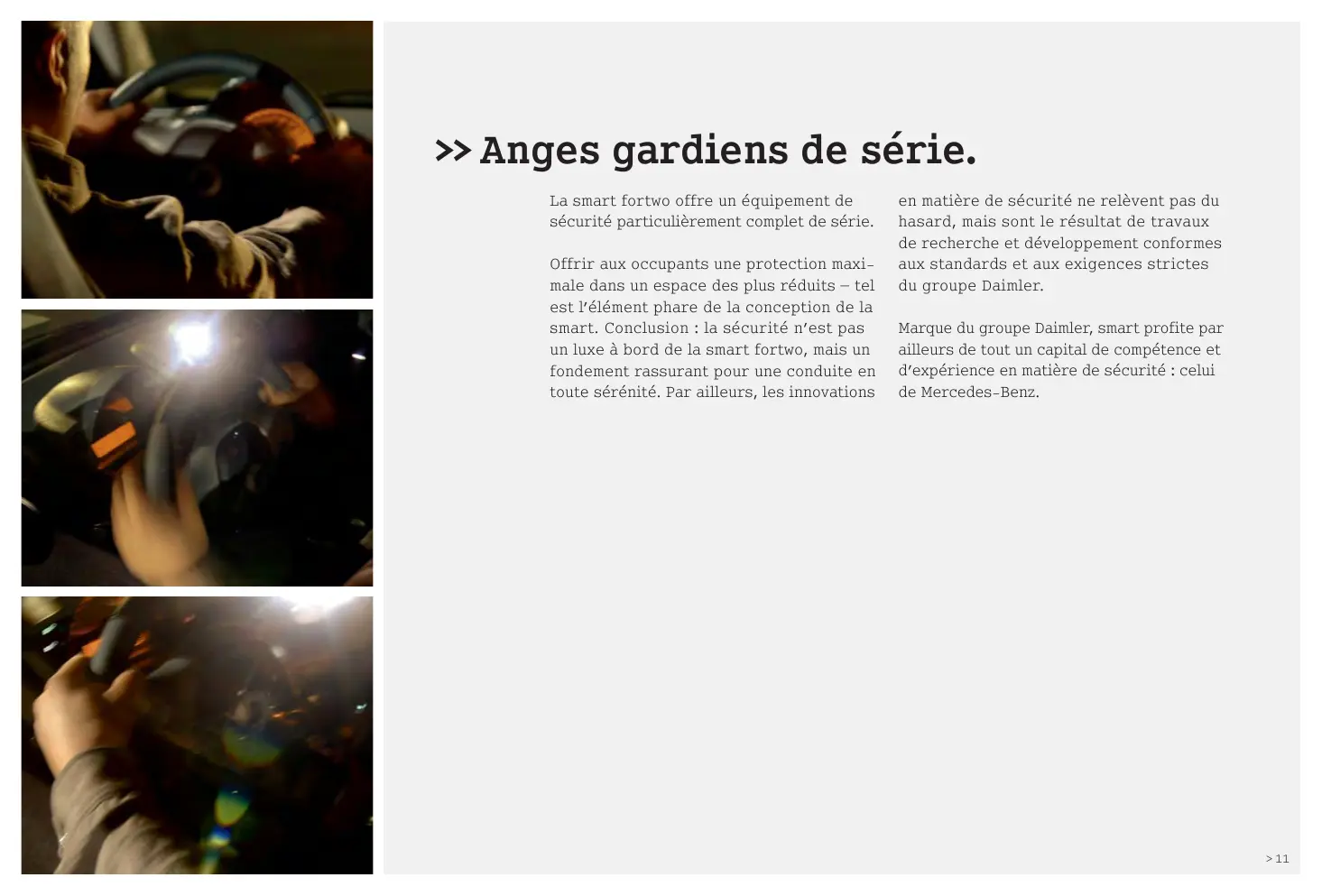 >> La mobilité commence dans la tête. Pour trouver des solutions efficaces, il faut parfois se poser des questions inhabituelles et sortir du cadre. Lorsque l’on est prêt à adopter un nouveau mode de pensée et d’action, on est aussi capable d’emprunter de nouvelles voies : « open your mind ». smart incarne cette philosophie depuis plus de dix ans et la smart fortwo constitue désormais une classe à part entière : un concept de véhicule exceptionnel et incomparable, qui exploite tout simplement de manière intelligente l’espace toujours plus réduit en ville. Faut-il équiper les voitures d’une banquette arrière quand on sait qu’en ville, elles ne sont occupées en moyenne que par 1,2 personne ? Un grand capot avant n’est-il pas un gaspillage de place alors que le moteur peut être logé à l’arrière ? A-t-on besoin d’une pédale d’embrayage sachant que la boîte de vitesses mécanique automatisée est mieux adaptée à la conduite en ville ? La taille est-elle un critère de sécurité alors même qu’un concept novateur peut offrir une protection maximale sur 2,69 m ? > 05 >> Avec moins, on fait bien plus ! La ville offre des possibilités infinies. Mais à quoi bon tous ces restaurants, cafés et boutiques s’il est impossible de se garer pour s’y rendre ? seulement 8,75 m. De plus, dans la smart fortwo, vous passez les rapports sans débrayer ni embrayer, et roulez détendu(e) même aux heures de pointe. Avec la smart fortwo, vous découvrez une multitude de possibilités de stationnement. Le moindre espace de 3 mètres entre deux voitures devient soudain assez grand. A l’intérieur du véhicule, vous savourez une étonnante impression d’espace. Quant au coffre, il est bien assez grand pour loger vos achats et vos bagages. La position surélevée des sièges offre une vue encore meilleure sur la circulation et facilite l’accès à bord. Pendant ce temps, l’indicateur du réservoir ne descend que lentement. Rien d’étonnant avec des moteurs aussi peu gourmands et un poids total aussi minime ! Fabriqués en matière plastique de qualité et entièrement recyclable, les panneaux de carrosserie, aussi appelés bodypanels, n’y sont pas étrangers. Du fait de leur légèreté, ils contribuent à l’excellent rapport poids/ puissance et à l’amélioration des performances routières, tout en réduisant la consommation de carburant. Mais surtout, ils sont robustes et pratiquement insensibles aux petits chocs ou éraflures. En plus de son confort, la smart fortwo vous permet de vous déplacer en ville avec souplesse et agilité. A son bord, vous vous faufilez partout et arrivez plus vite à destination. Il est vrai qu’elle possède un diamètre de braquage exceptionnel de Nous vous l’avions annoncé : la smart fortwo offre bien plus qu’il n’y paraît ! > 07 >> Profitez davantage de la vie. Avec la smart fortwo, vous ferez de nouvelles découvertes chaque jour, et jouirez d’une plus grande liberté. D’ailleurs, vous ne serez pas le seul. En effet, la smart profite aussi aux autres automobilistes, ne seraitce que parce qu’elle a besoin de moins place et en laisse davantage aux autres ! De plus, elle consomme peu et prend donc soin à la fois de votre porte-monnaie et de l’environnement. En effet, une voiture sobre est aussi une voiture qui rejette moins d’émissions polluantes. En d’autres termes, la smart fortwo contribue à améliorer la qualité de l’air en ville, quelle que soit sa motorisation : essence ou diesel. > 08 Le coût d’entretien de la smart est à l’image de sa consommation : minime. C’est plus agréable de dépenser son argent dans autre chose que de l’essence ou du gazole ! Alors, même le samedi, n’hésitez pas à prendre votre smart fortwo pour vous détendre et faire un petit tour en ville en toute simplicité : vous ne tournerez pas durant des heures pour trouver une place de stationnement ! Le coffre vous facilitera bien la vie : achats de la semaine ou excursion du week-end, vous serez étonné(e) de voir tout ce que l’on peut loger dans la smart. >> Anges gardiens de série. La smart fortwo offre un équipement de sécurité particulièrement complet de série. Offrir aux occupants une protection maximale dans un espace des plus réduits – tel est l’élément phare de la conception de la smart. Conclusion : la sécurité n’est pas un luxe à bord de la smart fortwo, mais un fondement rassurant pour une conduite en toute sérénité. Par ailleurs, les innovations en matière de sécurité ne relèvent pas du hasard, mais sont le résultat de travaux de recherche et développement conformes aux standards et aux exigences strictes du groupe Daimler. Marque du groupe Daimler, smart profite par ailleurs de tout un capital de compétence et d’expérience en matière de sécurité : celui de Mercedes-Benz. > 11 >> Appelez vos anges gardiens par leur nom ! > 12 >> Sécurité active. Tout pour éviter l’accident. >> Protection intégrale passive. Tout pour limiter les dommages si l’accident se produit malgré tout. Les systèmes de sécurité actifs vous aident à faire face aux situations critiques. Ils sont proposés de série dans chaque smart fortwo. En présence d’un risque de dérapage, la régulation de comportement dynamique (esp®) stabilise le véhicule en réduisant le couple du moteur et en exerçant un freinage ciblé sur une ou plusieurs roues, corrigeant ainsi la trajectoire. Pour assurer la sécurité dans un espace des plus réduits, il est impératif de disposer d’un système de gestion des collisions pensé jusque dans le moindre détail. La cellule de sécurité tridion de conception exceptionnelle et les éléments de sécurité complémentaires tels que la structure en sandwich, les caissons anticollision, les sièges intégraux de sécurité ou la roue exploitable comme élément de déformation, assurent une protection intégrale passive maximale. Le freina