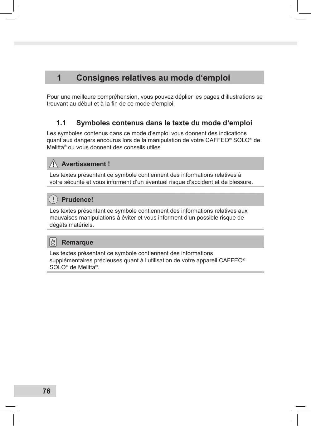 Les symboles contenus dans ce mode d‘emploi vous donnent des indications quant aux dangers encourus lors de la manipulation de votre CAFFEO® SOLO® de Melitta® ou vous donnent des conseils utiles. Les textes présentant ce symbole contiennent des informations relatives à votre sécurité et vous informent d‘un éventuel risque d'accident et de blessure. Les textes présentant ce symbole contiennent des informations relatives aux mauvaises manipulations à éviter et vous informent d‘un possible risque de dégâts matériels. Les textes présentant ce symbole contiennent des informations supplémentaires précieuses quant à l'utilisation de votre appareil CAFFEO® SOLO® de Melitta®.