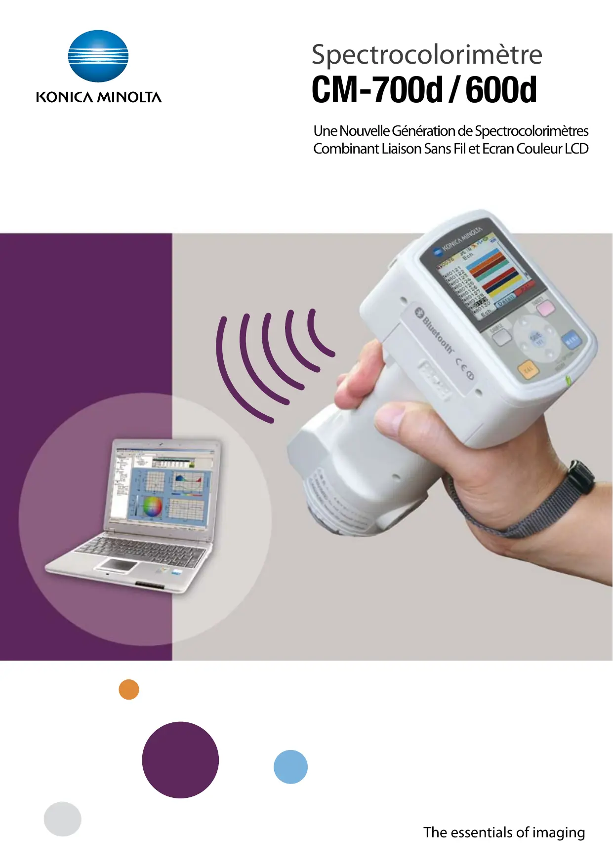 Spectrocolorimètre CM-700d / 600d Une Nouvelle Génération de Spectrocolorimètres Combinant Liaison Sans Fil et Ecran Couleur LCD The essentials of imaging CM-700d / 600d Une génération de spectrocolorimètres compacts et légers intégrant de nouvelles technologies pour un parfait traitement des informations! Le contrôle qualité objectif de la couleur à l’aide d’un instrument a prouvé sa fiabilité. Il propose des technologies pour tous les produits pour lesquels la couleur est un critère essentiel d’appréciation de la qualité comme la peinture, les matières plastiques, l’automobile, l’électroménager, la céramique, le textile, les cosmétiques et bien d’autres industries. De plus, les relations entre les différents acteurs du marchés – producteurs, assembleurs, acheteurs – rendent nécessaire et essentielle la communication précise de la couleur dans un monde de plus en plus coloré. La nouvelle génération de spectrocolorimètres portables Konica Minolta procure une simplicité d’utilisation sans précédent et une parfaite gestion de l’information par intégration de nouvelles technologies, par une ergonomie idéale et en appliquant notre savoir-faire Konica Minolta légendaire dans le domaine de l’optoélectronique et du traitement du signal. Les modèles CM-700d et CM-600d sont particulièrement indiqués pour la Recherche et Développement et le Contrôle Qualité en apportant une solution extrêmement souple et pratique alliée à de meilleures performances.