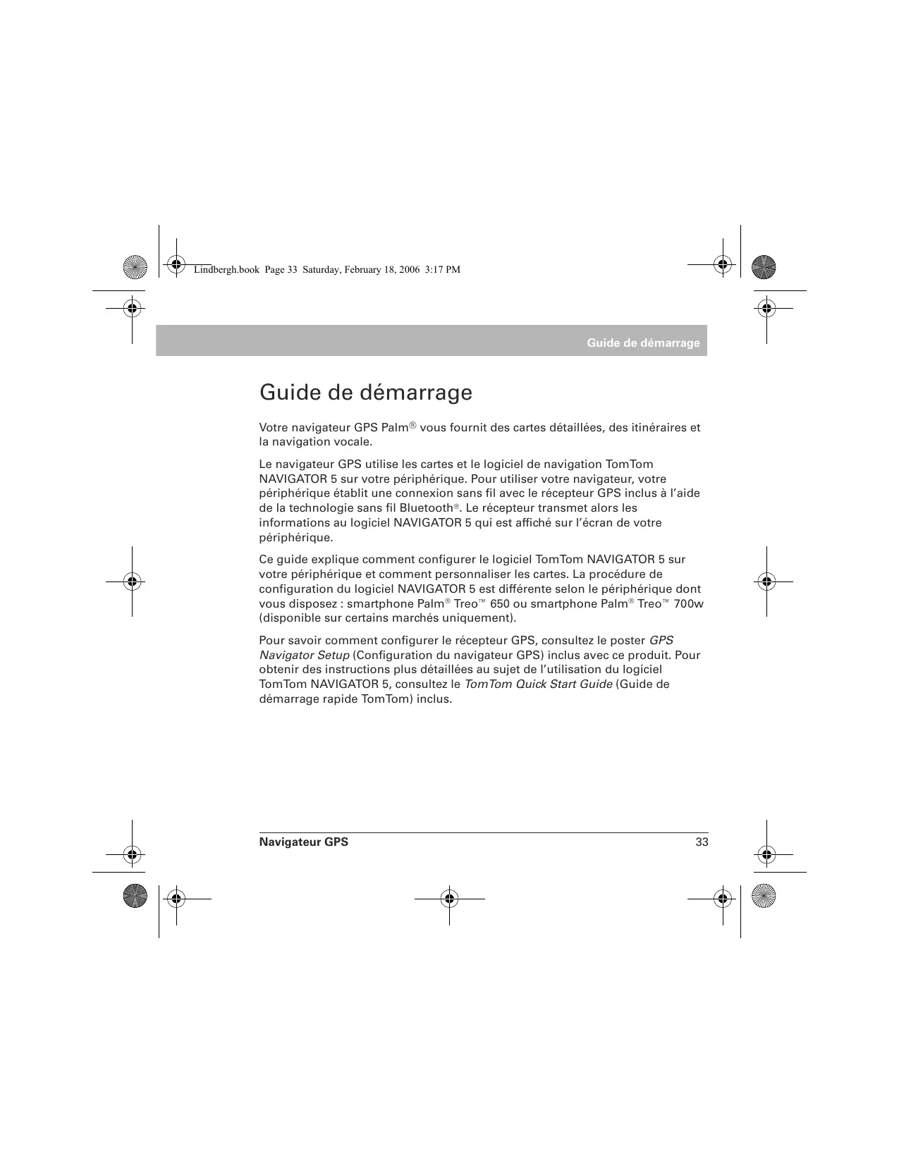 Canadian ICES-003 Statement This Class B digital apparatus meets all requirements of the Canadian InterferenceCausing Equipment Regulations. Cet appareil numérique de la classe B respecte toutes les exigences du Réglement sur le matériel brouilleur du Canada. Guide de démarrage Guide de démarrage Votre navigateur GPS Palm® vous fournit des cartes détaillées, des itinéraires et la navigation vocale. Le navigateur GPS utilise les cartes et le logiciel de navigation TomTom NAVIGATOR 5 sur votre périphérique. Pour utiliser votre navigateur, votre périphérique établit une connexion sans fil avec le récepteur GPS inclus à l’aide de la technologie sans fil Bluetooth®. Le récepteur transmet alors les informations au logiciel NAVIGATOR 5 qui est affiché sur l’écran de votre périphérique. Ce guide explique comment configurer le logiciel TomTom NAVIGATOR 5 sur votre périphérique et comment personnaliser les cartes. La procédure de configuration du logiciel NAVIGATOR 5 est différente selon le périphérique dont vous disposez : smartphone Palm® Treo™ 650 ou smartphone Palm® Treo™ 700w (disponible sur certains marchés uniquement). Pour savoir comment configurer le récepteur GPS, consultez le poster GPS Navigator Setup (Configuration du navigateur GPS) inclus avec ce produit. Pour obtenir des instructions plus détaillées au sujet de l’utilisation du logiciel TomTom NAVIGATOR 5, consultez le TomTom Quick Start Guide (Guide de démarrage rapide TomTom) inclus. Navigateur GPS