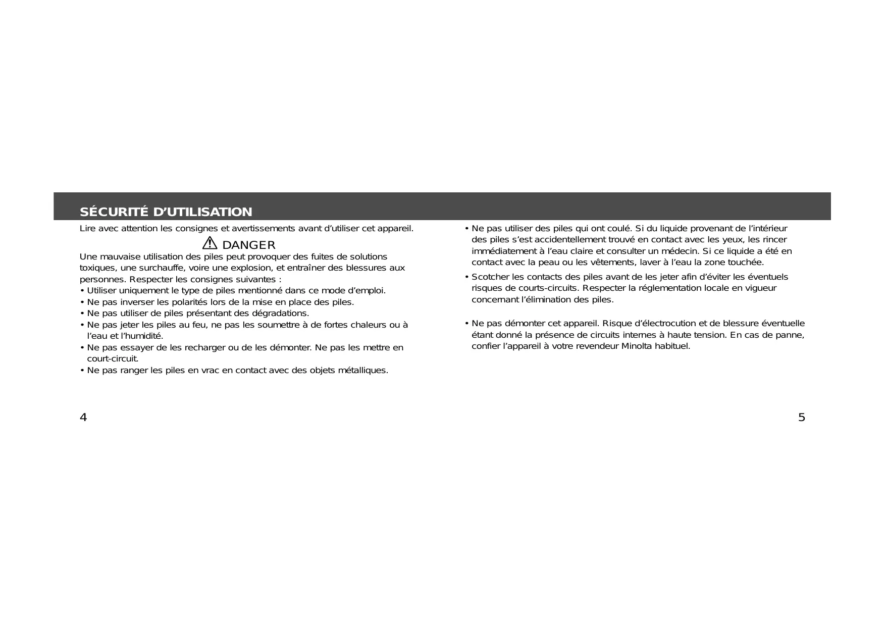 Lire avec attention les consignes et avertissements avant d’utiliser cet appareil. DANGER Une mauvaise utilisation des piles peut provoquer des fuites de solutions toxiques, une surchauffe, voire une explosion, et entraîner des blessures aux personnes. Respecter les consignes suivantes :