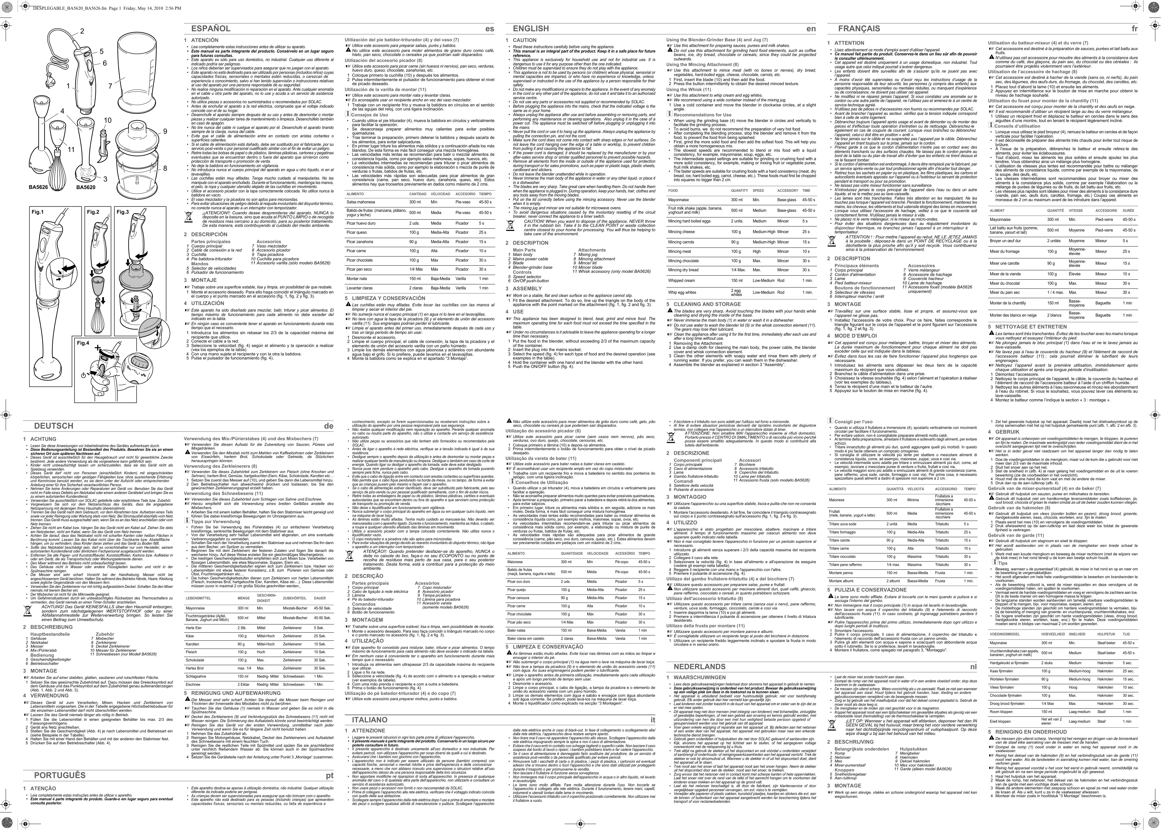 Utlizzare un recipiente freddo leggermente inclinato € spostare la frusta in modo Gircolare e in senso orario. 1 ATTENTION Lisez attentivement ce mode d'emploi avant d'utliser l'appareil Ce manuel fait partie du produit. Conservez-le dans un lieu sûr afin de pouvoir le consulter ultérieurement. Cet appareil est destiné uniquement à un usage domestique, non industriel. Tout usage autre que celui indiqué pourrait s'avérer dangereux. Les enfants doivent être surveilés afin de s'assurer qu'ils ne jouent pas avec l'appareil À mains d'avoir &é supenisées ou d'avoir reçu les instucions d'usage de la personne responsable de leur sécurité, les personnes (y compris des enfants) aux capacités physiques, sensorielles ou mentales réduites, ou manquant d'expérience où de connaissance, ne doivent pas utiliser cet appareil. + Ne modifiez ni ne réparez jamais l'appareil. Si vous constatez une anomalie sur le Gordon ou une autre partie de l'appareil ne l'utlisez pas et amenez-e à un centre de service technique agréé. Nulisez pas de plèces ni d'accessoires non fourmis ou recommandés par SOLAC. Avant de brancher l'appareil au secteur, vérifiez que la tension indiquée correspond bien à celle de votre logement. Débranchez toujours l'appareil après usage et avant de démonter ou de monter des pièces et d'effectuer toute opération d'entretien ou de nettoyage. Débranchez-le également en cas de coupure de courant. Lorsque vous bränchez ou débranchez l'appareil, celui-ci doit être en position « arrêt ». Ne tirez jamais sur le câble ef ne suspendez pas l'appareil par le câble. Débranchez l'appareil en trant toujours sur la prise, jamais sur le cordon. Prenez garde à ce que le cordon d'alimentation n'entre pas en contact avec des éléments tranchants ou des surfaces chaudes. Ne laissez pas le cordon pendre au bord de la table ou du plan de travail afin d'éviter que les enfants ne tirent dessus et ne le fassent tomber. Sile cordon d'alimentation est endommagé, i devra être remplacé par le fabricant, par un service après-vente ou par tout professionnel agréé afin d'écarter tout danger. Retrez tous les sachets en papier ou en plastique, les fims plastiques, les cartons et autocollants éventuels apposés sur l'appareil ou à l'extérieur lu servant de protection pendant l transport ou pour sa promotion Ie laissez pas votre mixeur fonctionner sans surveillance Nintroduisez jamais le corps principal de l'appareil dans l'eau ou dans un autre liquide, et ne le mettez pas au lave-vaisselle. Les lames sont très tranchantes. Faites trés attention en les manipulant. Ne les touchez pas lorsque l'appareil est branché. Pendant le fonctionnement, maintenez les mains, les cheveux, les vêtements et tout ustensile éloigné des lames en mouvement Lorsque vous utilisez l'accessoire de hachage, veilez à ce que le couvercle soit correctement fermé. N'utlisez jamais le mixeur à vide. Ne placez ni le verre mélangeur, ni le mixeur au micro-ondes. Pour éviter des situations dangereuses dues au réajustement involontaire du disjoncteur thermique, ne branchez jamais l'appareil à un interrupteur à temporisateur. ATTENTION ! : Pour mettre l'appareil au rebut, NE LE JETEZ JAMAIS Y à la poubelle ; déposez-le dans un POINT DE RECYCLAGE ou à la 2 déchetterie la plus proche afin qu'il y soit recyclé. Vous contribuerez ainsi à la préservation de l'environnement. 2 DESCRIPTION Principaux éléments Corps principal Cordon d'alimentation Accessoires 1 7 Verre mélangeur 2 8 Accessoire de hachage 3 Lame 9 Couvercle hacheur 4 Pied batteur-mixeur 10 Lame de hachage Boutons de fonctionnement 11 Accessoire fouet (modèle BA5626 5 Sélecteur de vitesses. uniquement) 6 Interrupteur marche / arrêt 3 MONTAGE “x Travaillez sur une surface stable, lisse et propre, et assurez-vous que l'appareil ne glisse pas. 1 Installez l'accessoire de votre choix. Pour ce faire, faites correspondre le tiangle figurant sur le corps de l'appareil et le point figurant sur l'accessoire (fig. 1, fig. 2 et fig. 3) MODE D'EMPLOI Ki Cet appareil est conçu pour mélanger, battre, broyer et mixer des aliments. La durée maximum de fonctionnement pour chaque aliment ne doit pas excéder celle qui est indiquée dans le tableau. sx Évitez dans tous les cas de faire fonctionner l'appareil plus longtemps que nécessaire 1 Introduisez les aliments sans dépasser les deux tiers de la capacité maximum du récipient que vous utilisez. Branchez le câble d'alimentation dans une prise. Choisissez la vitesse souhaitée (fig. 4) selon l'aliment et l'opér {voir les exemples du tableau). Tenez le récipient d'une main et le batteur de l'autre. Appuyez sur le bouton de mise en marche (fig. 4).
