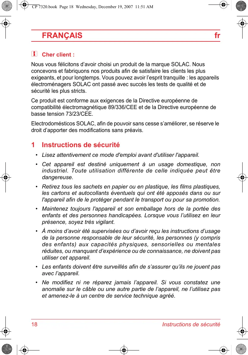 Retrouvez gratuitement la notice de l'appareil CP7320 SOLAC au format PDF.