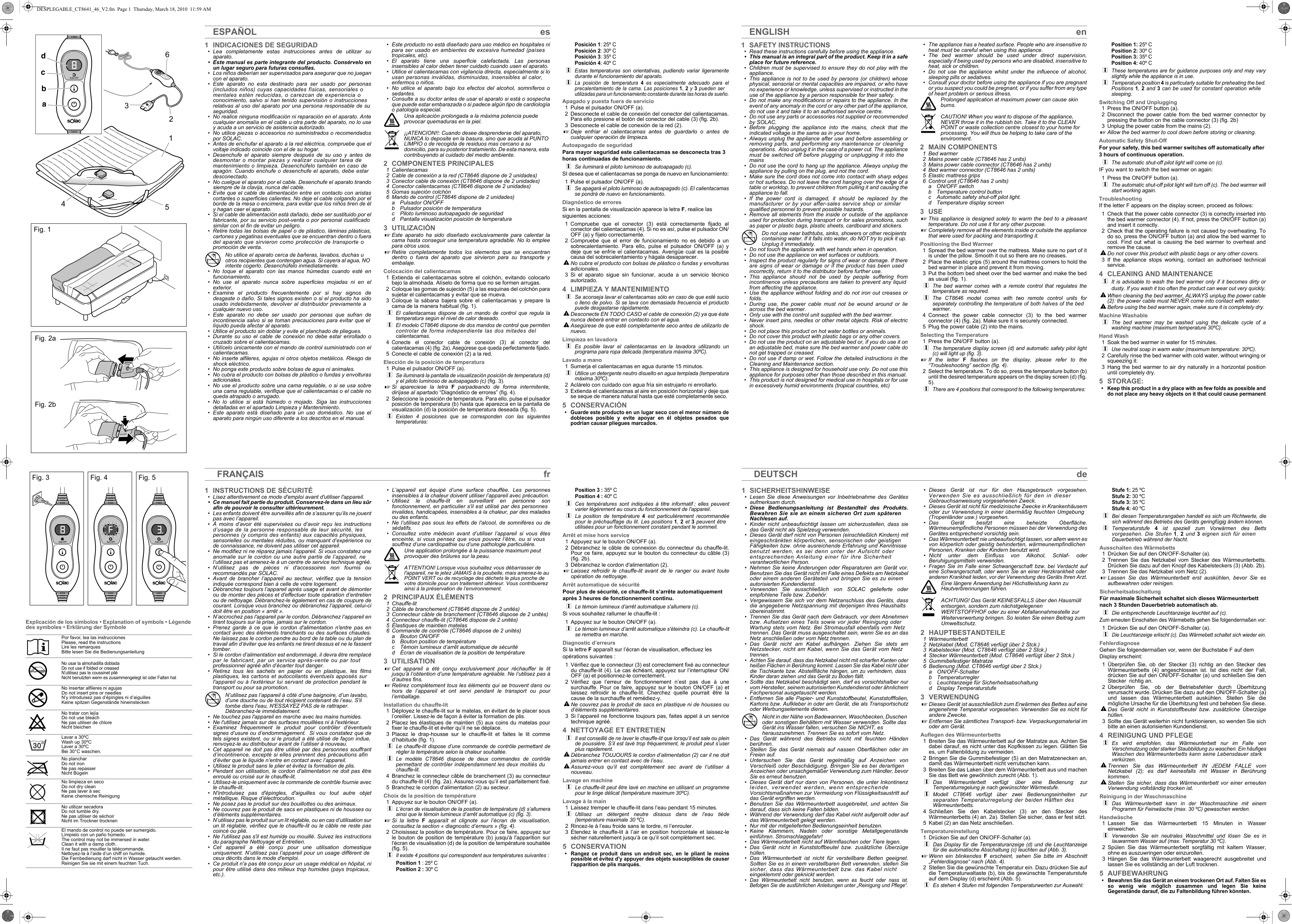 Position 3: 35^ C Position 4: 40^ C 1 Ces temperatures are indiquées à titre informatif; elles peuvent varier légément au cours du fonctionnement de l'appareil. La position de température 4 est particulièrement recommendée pour le préchauffage du lit. Les positions 1, 2 et 3 peuvent être utilisées pour un fonctionnement constant pendant le sommeil. Arrêt et mise hors service 1. Appuyez sur Je bouton ON/OFF (a) 2 Débranche le cable de connexion du connecteur du chauffe-lit. Pour ce faire, appuyez sur le bouton du connecteur du cable (3) (fig. 2b). 3 Debranchez le cordon d'alimentation (2) Laissez refroidir le chauffe-lit avant de I regarder ou avant toute operation de nettoyage. Arrêt automatique de sécurité Pour plus de sécurité, cechauffe-lit s'arrête automatiquement 2. après 3 heures de fonctionnement continu Le témoin lumineux d'arrêt automatique s'allumera (c). Si yous souhaitez rallumer le chauffe-l 1 Appuyez sur le bouton ON/OFF (a) 1 Le témoin lumineux d'arret automatique s'téeindra (c). Le chauffe-lin se rematra en marche. Diagnostic d'erreurs Si la dette F apparait sur I'ecran de visualisation, effectuez le opérations suivantes 1 Verifie que le connecteur (3) est correctement fixé au connecteur du chauff-lit (4). Le cas échéant, appuyez sur l'interrupteur ON/OFF (a) et positionné le correctement. 2 Vérifie que l'erreur de fonctionnement n'est pas due à une surchauffe. Pour ce faire, appuyez sur le bouton ON/OFF (a) et laissiez refroidir la chauffit-léch. Cherchez qu'elle pourrait être la cause de la surchauffe et reméditez-v. Ne couvrez pas le produit de sacs en plastique ni de housses ou d'éléments supplémentaires. 3 Si l'appareil ne fonctionne toujours pas, faites appel à un service technique/agré. 4 NETTOYAGE ET ENTRETIEN Il est conseilé de ne laver le chauffe-lit que lorsqu'il est sale ou plein de poussière. Si l'est lavé trop féquement, le produit peut s'user plus rapidement. Débranche TOLUJOURS le cordon d'alimentation (2) car il ne doit jamais entraient en contact avec de l'eau. Assurez-vous qu'il est complètement sec avant de l'utiliser à nouveau. Lavage en machine 1 Le chauffe-lit peut être lavé en machine en utilisant un programme pour le linge délicat (température maximum 30°C ). Lavage à la main 1 Laissez tremper le chauffe-lit dans l'eau pendant 15 minutes. 1 Utilisez un détergent neutre dissous dans de l'eau tiéde (température maximale 30°C ). 2 Rincez-le a l'eau froide sans le tordre, ni I'enrouler 3 Etendez le chauffe-lit à l'air en position horizontal et laisssez-le sécher naturellement jusqu'à ce qui soit complètement sec. 5. CONSERVATION - Rangez ce produit dans un endroit sec, en le piant le moins possible et évitez d'y appuyer des objets susceptibles de cause l'apparition de plis marqués.