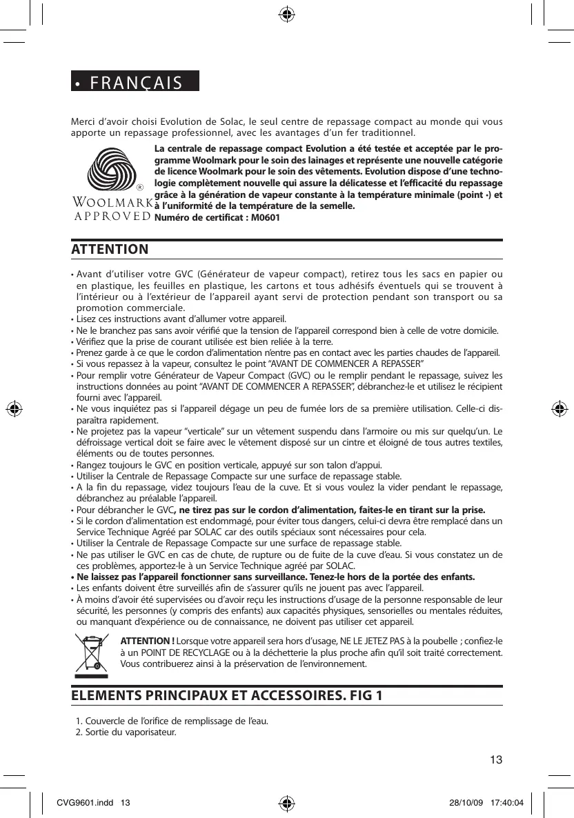 FRANÇAIS Merci d'avoir choisi Evolution de Solac, le seul centre de repassage compact au monde qui vous apporte un repassage professionnel, avec les avantages d'un fer traditionnel. La centrale de repassage compact Evolution a été testée et acceptée par le pro- gramme Woolmark pour le soin des lainages et représente une nouvelle catégorie de licence Woolmark pour le soin des vêtements. Evolution dispose d'une techno- Logie complètement nouvelle qui assure la délicatesse et l'efficacité du repassage ’ e à la génération de vapeur constante Jet W/OOLM ARK3 l'uniformité de la température de la semelle. APPRO VE D Numéro de ce: ATTENTION + Avant d'utiliser votre GVC (Générateur de vapeur compact}, retirez tous les sacs en papier ou en plastique, les feuilles en plastique, les cartons et tous adhésifs éventuels qui se trouvent à l'intérieur ou à l'extérieur de l'appareil ayant servi de protection pendant son transport ou sa promotion commerciale. z ces instructions avant d'allumer votre appareil - Ne le branchez pas sans avoir vérifié que la tension de l'appareil correspond bien à celle de votre domicile. - Vérifiez que la prise de courant utilisée est bien reliée à la terre. - Prenez garde à ce que le cordon d'alimentation nientre pas en contact avec les parties chaudes de l'appareil. - Si vous repassez à la vapeur, consultez le point AVANT DE COMMENCER À REPASSER" - Pour remplir votre Générateur de Vapeur Compact (GVC) ou le remplir pendant le repassage, suivez les instructions données au point AVANT DE COMMENCER À REPASSER” débranchez-le et utilisez le récipient fourni avec l'appareil. + Ne vous inquiétez pas si l'appareil dégage un peu de fumée lors de sa première paraîtra rapidement. + Ne projetez pas la vapeur “verticale” sur un vêtement suspendu dans l'armoire ou mis sur quelqu'un. Le défroissage vertical doit se faire avec le vêtement disposé sur un cintre et éloigné de tous autres textiles, éléments ou de toutes personnes. + Rangez toujours le GVC en position verticale, appuyé sur son talon d'appui. - Utiliser la Centrale de Repassage Compacte sur une surface de repassage stable. A la fin du repassage, videz toujours l'eau de la cuve. Et si vous voulez la vider pendant le repassage, débranchez au préalable l'appareil. - Pour débrancher le GVC, ne tirez pas sur le cordon d'alimentation, faites-le en : Sile cordon d'alimentation est endommagé, pour éviter tous dangers, celui-ci devra être remplacé dans un Service Techt é par SOLAC car des outils spéciaux sont nécessaires pour cela + Utiliser la Centrale de Repassage Compacte sur une surface de repassage stable. + Ne pas utiliser le GVC en cas de chute, de rupture ou de fuite de la cuve d'eau. Si vous constatez un de ces problèmes, apportez-le à un Service Technique agréé par SOLAC. + Ne laissez pas l'appareil fonctionner sans surveillance, Tenez-le hors de la portée des enfants. - Les enfants doivent être surveillés afin de s'assurer qu'ils ne jouent pas avec l'appareil. + À moins d'avoir été supervisées ou d'avoir reçu les instructions d'usage de la personne responsable de leur sécurité, les personnes (y compris des enfants) aux capacités physiques, sensorielles ou mentales réduites, où manquant d'expérience ou de connaissance, ne doivent pas utiliser cet appareil sation. Celle-ci dis- ATTENTION ! Lorsque votre appareil sera hors d'usage, NE LE JETEZ PAS à la poubelle ; confiez-le à un POINT DE RECYCLAGE ou à la déchetterie la plus proche afin qu'il soit traité correctement. Vous contribuerez ainsi à la préservation de l'environnement.