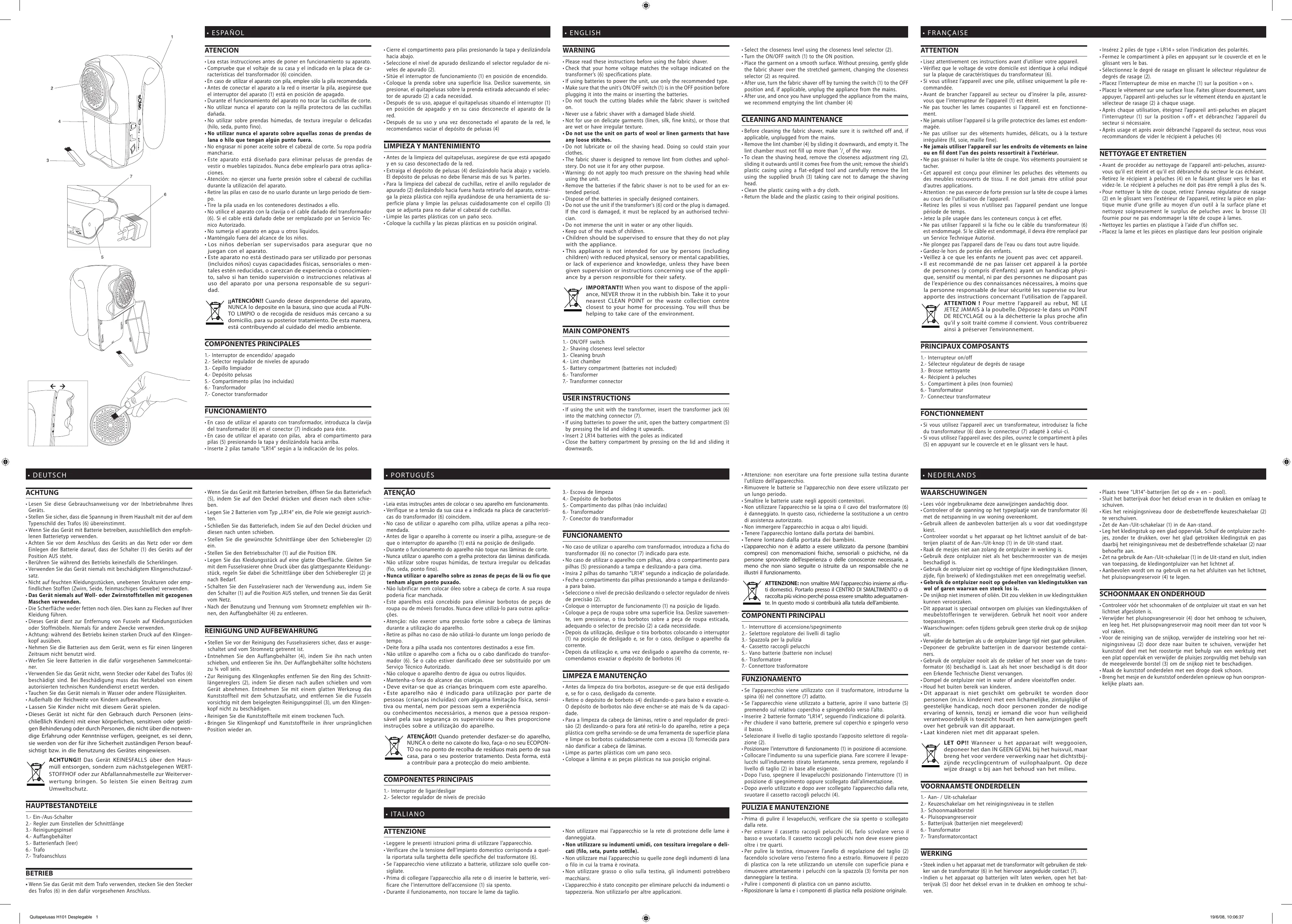 - Prima di pulire il levapelucchi, verificare che sia spento o scollegato dalla rete. -Per estrarre il cassetto raccogli pelucchi (4), farlo scivolare verso il basso e suotarlo. Il cassetto raccogli pelucchi non deve essere pieno oltre i tre quart -Per pulire la testina, rimuovere l'anello di regolazione del taglio (2) facendolo scivolare verso l'esterno fino a estrarlo. Rimuovere il pezzo di plastica con la rete utilizzando un utensile con superficie piana e rimuovere attentamente i pelucchi con la spazzola (3) fornita per non danneggiare la testina + Pulire i componenti di plastica con un panno asciutto. - Riposizionare la lama ei componenti di plastica nella posizione originale. + FRANÇAISE ATTENTION « Lisez attentivement ces instructions avant d'utiliser votre appareil. - Vérifiez que le voltage de votre domicile est identique à celui indiqué sur la plaque de caractéristiques du transformateur (6) : Si vous utilisez l'appareil avec une pile, utilisez uniquement la pile re- commandée. + Avant de brancher l'appareil au secteur ou d'insérer la pile, assurez- vous que l'interrupteur de l'appareil (1) est éteint. + Ne pas toucher les lames coupantes si l'appareil est en fonctionne ment. + Ne jamais utiliser l'appareil si la grille protectrice des lames est endom- magée. +Ne pas utiliser sur des vêtements humides, délicats, ou à la texture irrégulière (fi, soie, maille fine) + Ne jamais utiliser l'appareil sur les endroits de vêtements en laine ou en fil dont l’un des points ressortirait à l'extérieur. + Ne pas graisser ni huiler la tête de coupe. Vos vêtements pourraient se tacher. - Cet appareil est conçu pour éliminer les peluches des vêtements ou des meubles recouverts de tissu. Il ne doit jamais être utilisé pour d'autres applications. - Attention :ne pas exercer de forte pression sur la tête de coupe à lames au cours de l'utilisation de l'appareil Retirez les piles si vous n'utilisez pas l'appareil pendant une longue période de temps - Jetez la pile usagée dans les conteneurs conçus à cet effet. + Ne pas utiliser l'appareil si la fiche ou le câble du transformateur (6) est endommagé. Si le câble est endommagé, il devra être remplacé par un Service Technique Autorisé. + Ne plongez pas l'appareil dans de l'eau ou dans tout autre liquide. + Gardez-le hors de portée des enfants. + Veillez à ce que les enfants ne jouent pas avec cet appareil. +Il est recommandé de ne pas laisser cet appareil à la portée de personnes (y compris d'enfants) ayant un handicap physi- que, sensitif ou mental, ni par des personnes ne disposant pas de l'expérience ou des connaissances nécessaires, à moins que la personne responsable de leur sécurité les supervise ou leur apporte des instructions concernant l'utilisation de l'appareil. ATTENTION ! Pour mettre l'appareil au rebut, NE LE JETEZ JAMAIS à la poubelle. Déposez-le dans un POINT DE RECYCLAGE ou à la déchetterie la plus proche afin qu'il y soit traité comme il convient. Vous contribuerez ainsi à préserver l'environnement. PRINCIPAUX COMPOSANTS