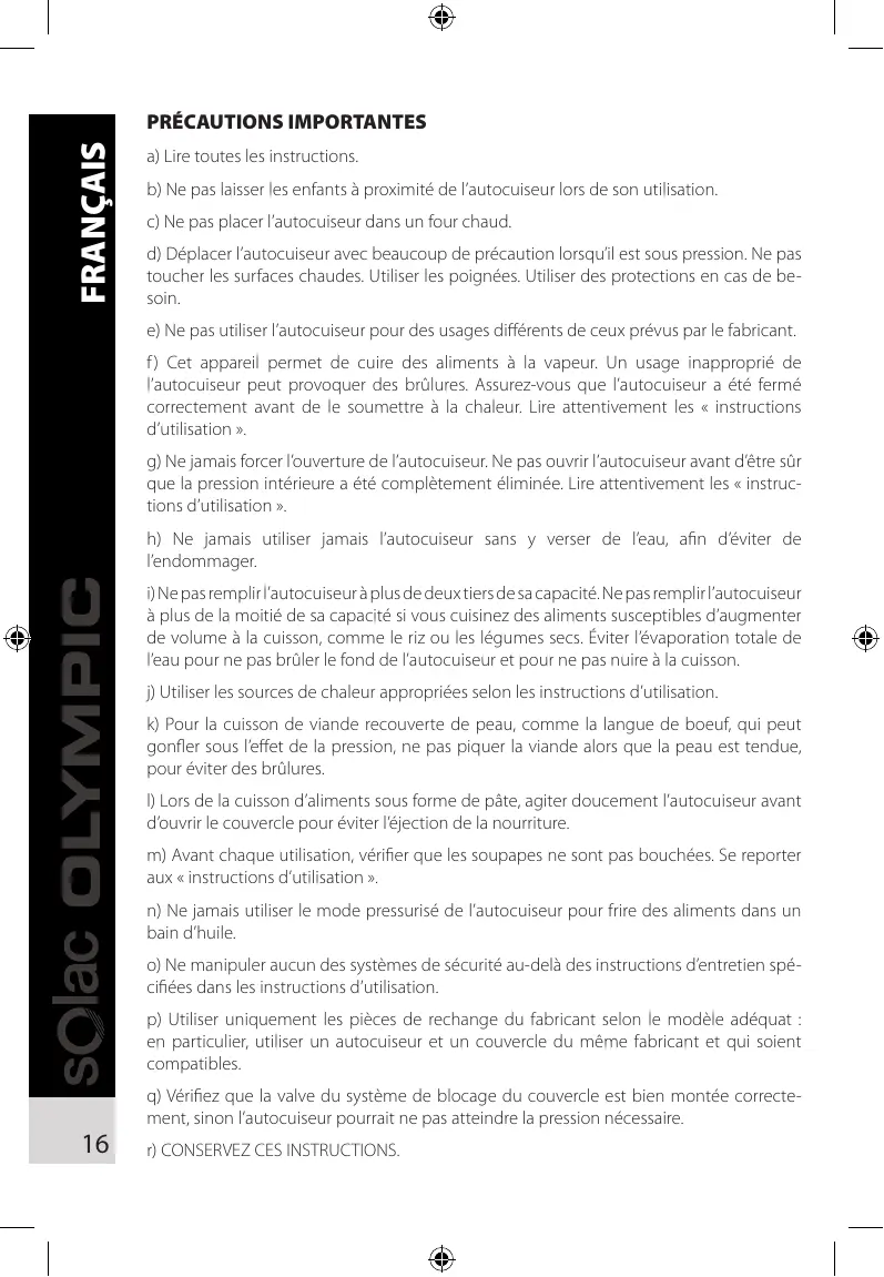 a) Lire toutes les instructions. b) Ne pas laisser les enfants à proximité de l'autocuiseur lors de son utilisation. c) Ne pas placer l'autocuiseur dans un four chaud. d) Déplacer l'autocuiseur avec beaucoup de précaution lorsqu'il est sous pression. Ne pas toucher les surfaces chaudes. Utiliser les poignées. Utiliser des protections en cas de besoin. e) Ne pas utiliser l'autocuiseur pour des usages différents de ceux prévus par le fabricant. f) Cet appareil permet de cuire des aliments à la vapeur. Un usage inapproprié de l'autocuiseur peut provoquer des brûlures. Assurez-vous que l'autocuiseur a été fermé correctement avant de le soumettre à la chaleur. Lire attentivement les « instructions d'utilisation » g) Ne jamais forcer l'ouverture de l'autocuiseur. Ne pas ouvrir l'autocuiseur avant d'être sûr que la pression intérieure a été complètement éliminée. Lire attentivement les « instructions d'utilisation » h) Ne jamais utiliser l'autocuiseur sans y verser de l'eau, afin d'éviter de l'endommager. i) Ne pas remplir l'autocuiseur à plus de deux tiers de sa capacité. Ne pas remplir l'autocuiseur à plus de la moitié de sa capacité si vous cuisinez des aliments susceptibles d'augmenter de volume à la cuisson, comme le riz ou les légumes secs. Éviter l'évaporation totale de l'eau pour ne pas brûler le fond de l'autocuiseur et pour ne pas nuir à la cuisson. j) Utiliser les sources de chaleur appropriées selon les instructions d'utilisation. k) Pour la cuisson de viande recouverte de peau, comme la langue de bœuf, qui peut gonfler sous l'effet de la pression, ne pas piquer la viande alors que la peau est tendue, pour éviter des brûlures. l) Lors de la cuisson d'aliments sous forme de pâté, agiter doucement l'autocuiseur avant d'ouvrir le couvercle pour éviter l'éjection de la nourriture. m) Avant chaque utilisation, vérifier que les soupapes ne sont pas bouchées. Se reporter aux « instructions d'utilisation » n) Ne jamais utiliser le mode pressurisé de l'autocuiseur pour frire des aliments dans un bain d'huile. o) Ne manipuler aucun des systèmes de sécurité au-delà des instructions d'entretien spécifiques dans les instructions d'utilisation. p) Utiliser uniquement les pièces de rechange du fabricant selon le modèle ajustat : en particulier, utiliser un autocuiseur et un couvercle du même fabricant et qui soient compatibles. q) Vérifier que la valve du système de blocage du couvercle est bien montée correctement, sinon l'autocuiseur pourrait ne pas atteindre la pression nécessaire. r) CONSERVEZ CES INSTRUCTIONS.