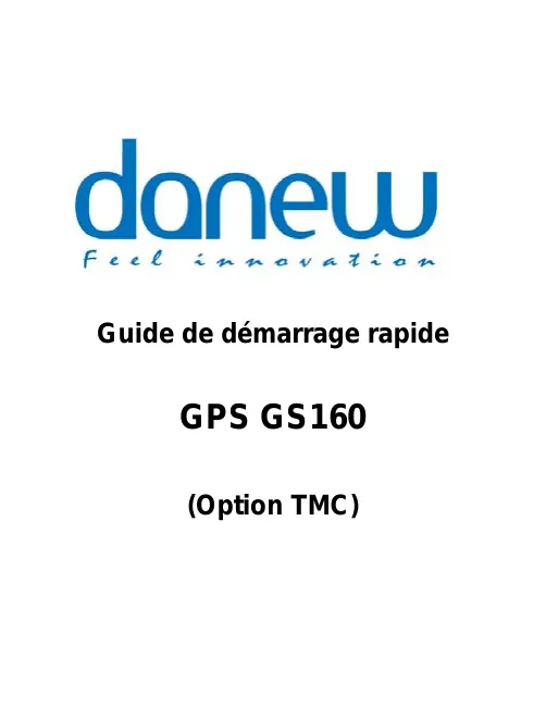 Faites fonctionner l’option TMC en vous procurant le support TMC disponible à la vente chez les revendeurs agréés DANEW ou sur le site www.danew.com/store Pour des questions techniques, contactez la hotline technique en France: Tél: 0899 782 728 Quick start GPS GS160 TMC Ready (Accessory in option) Quick start