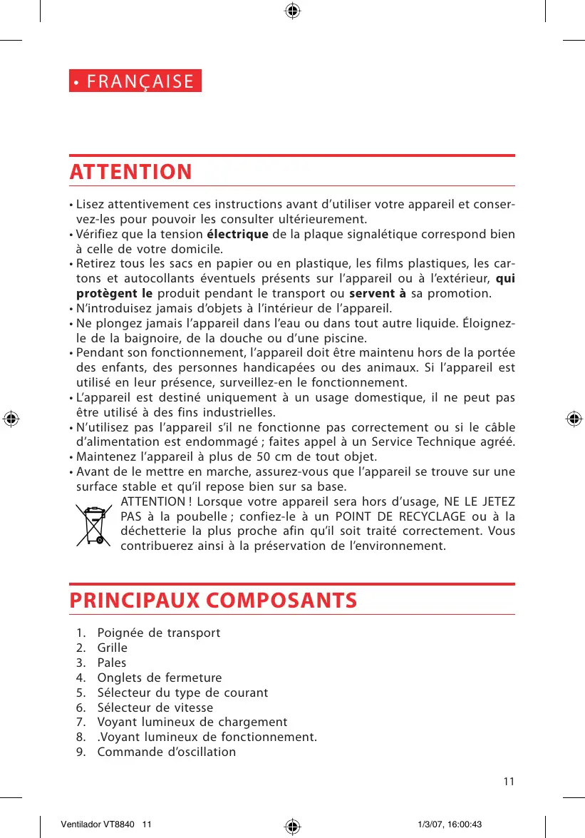 ATTENTION ! Lorsque votre appareil sera hors d'usage, NE LE JETEZ PAS à la poubelle ; confiez-le à un POINT DE RECYCLAGE ou à la déchetterie la plus proche afin qu'il soit traité correctement. Vous contribuerez ainsi à la préservation de l'environnement.