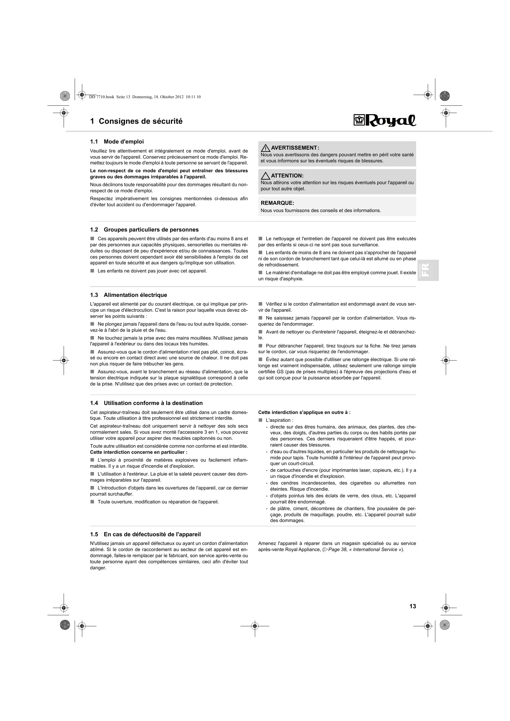 Les enfants de moins de 8 ans ne doivent pas s'approcher de l'appareil ni de son cordon de branchement tant que celui-là est allumé ou en phase de refroidissement. Cette interdiction s'applique en outre à : L'aspiration : - directe sur des êtres humains, des animaux, des plantes, des cheveux, des doigts, d'autres parties du corps ou des habits portés par des personnes. Ces derniers risqueraient d'être happés, et pourraient causer des blessures. - d'eau ou d'autres liquides, en particulier les produits de nettoyage humide pour tapis. Toute humidité à l'intérieur de l'appareil peut provoquer un court-circuit. - de cartouches d'encre (pour imprimantes laser, copieurs, etc.). Il y a un risque d'incendie et d'explosion. - des cendres incandescentes, des cigarettes ou allumettes non éteintes. Risque d'incendie. - d'objets pointus tels des éclats de verre, des clous, etc. L'appareil pourrait être endommagé. - de plâtre, ciment, décombres de chantiers, fine poussière de perçage, produits de maquillage, poudre, etc. L'appareil pourrait subir des dommages. En cas de défectuosité de l'appareil N'utilisez jamais un appareil défectueux ou ayant un cordon d'alimentation abîmé. Si le cordon de raccordement au secteur de cet appareil est endommagé, faites-le remplacer par le fabricant, son service après-vente ou toute personne ayant des compétences similaires, ceci afin d'éviter tout danger. Amenez l'appareil à réparer dans un magasin spécialisé ou au service après-vente RoyalAppliance, (Page 38, « International Service »).