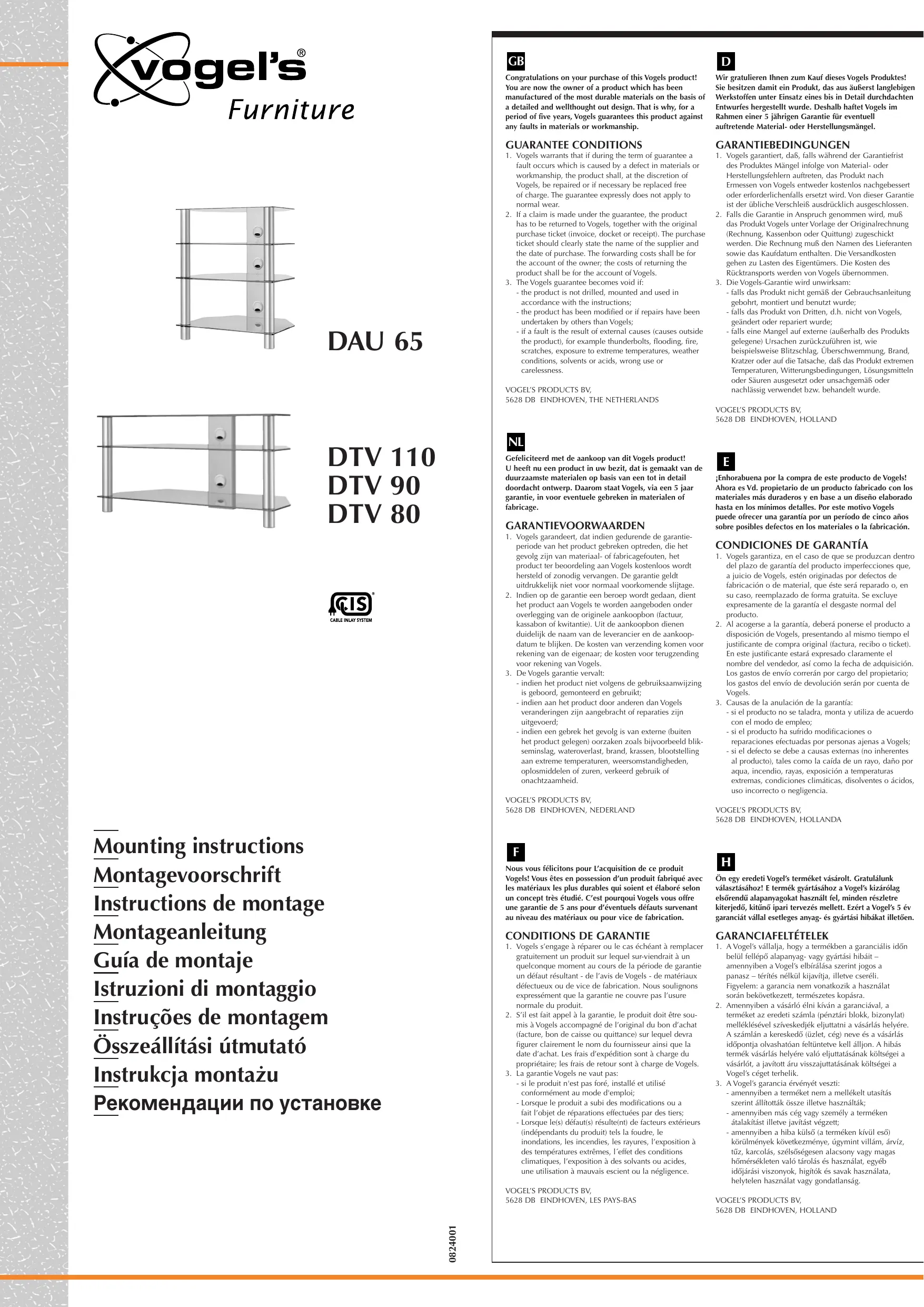 Nous vous félicitons pour l'acquisition de ce produit Vogels! Vous êtes en possession d'un produit fabriqué avec les matériaux plus durables qui soient et élaboré selon un concept très étudié. C'est beaucoup. Vogels vous offre une garantie de 5 ans pour d'éventuels défauts survenant au niveau des matériaux ou pour vice de fabrication.