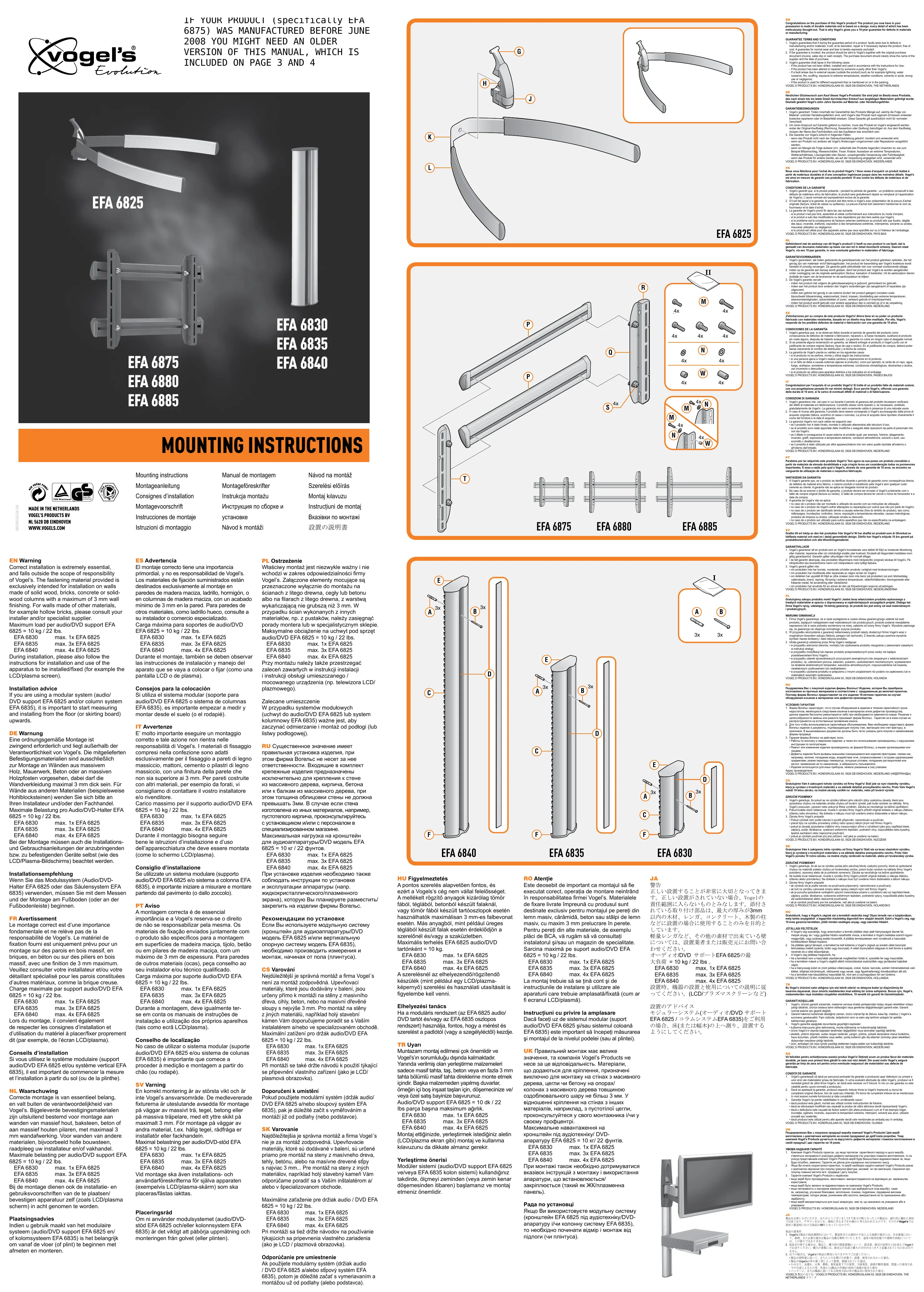 responsabilité de Vogel's. Le matériel de fixation fourni est uniquement prévu pour un montage sur des parois en bois massif, en briques, en béton ou sur des piliers en bois massif, avec une finition de 3 mm maximum. Veillez consulter votre installateur et/ou votre détaillant spécialisé pour les parois constituées d'autres matériaux, comme la brique creuse. Charge maximale par support audio/DVD EFA 6825 = 10kg / 22 lbs. Maximum 3 supports audio/DVD EFA 6825 par système vertical EFA 6835. Poids maximal de l'écran LCD: EFA 6875 = 25kg / 45 lbs.