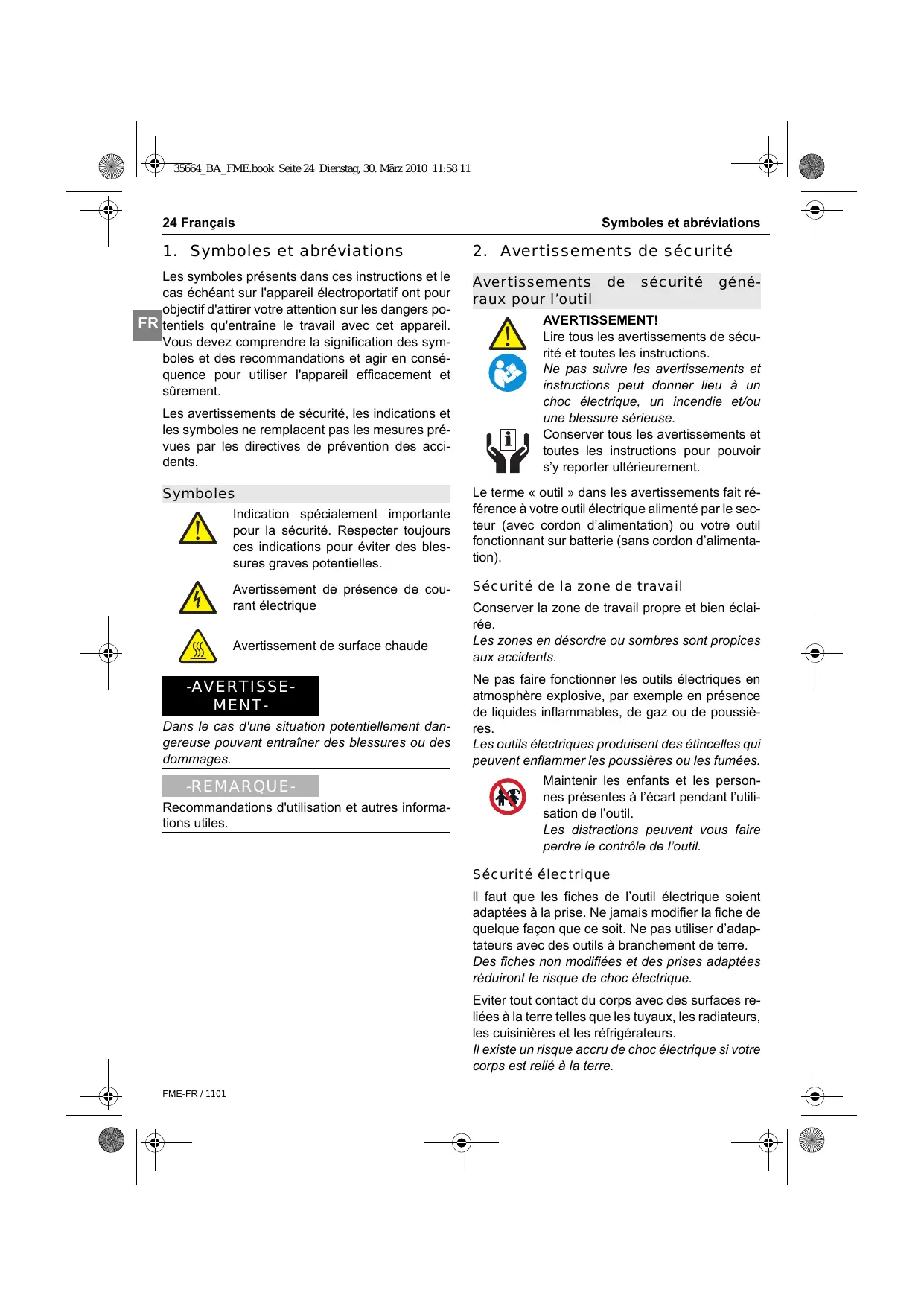 sécurité géné- AVERTISSEMENT! Lire tous les avertissements de sécurité et toutes les instructions. Ne pas suivre les avertissements et instructions peut donner lieu à un choc électrique, un incendie et/ou une blessure sérieuse. Conserver tous les avertissements et toutes les instructions pour pouvoir s’y reporter ultérieurement. Le terme « outil » dans les avertissements fait référence à votre outil électrique alimenté par le secteur (avec cordon d’alimentation) ou votre outil fonctionnant sur batterie (sans cordon d’alimentation). Sécurité de la zone de travail Conserver la zone de travail propre et bien éclairée. Les zones en désordre ou sombres sont propices aux accidents. Ne pas faire fonctionner les outils électriques en atmosphère explosive, par exemple en présence de liquides inflammables, de gaz ou de poussières. Les outils électriques produisent des étincelles qui peuvent enflammer les poussières ou les fumées. Maintenir les enfants et les personnes présentes à l’écart pendant l’utilisation de l’outil. Les distractions peuvent vous faire perdre le contrôle de l’outil. Sécurité électrique ll faut que les fiches de l’outil électrique soient adaptées à la prise. Ne jamais modifier la fiche de quelque façon que ce soit. Ne pas utiliser d’adaptateurs avec des outils à branchement de terre. Des fiches non modifiées et des prises adaptées réduiront le risque de choc électrique. Eviter tout contact du corps avec des surfaces reliées à la terre telles que les tuyaux, les radiateurs, les cuisinières et les réfrigérateurs. Il existe un risque accru de choc électrique si votre corps est relié à la terre. FME-FR / 1101 Avertissements de sécurité Français 25 Ne pas exposer les outils à la pluie ou à des conditions humides. La pénétration d’eau à l’intérieur d’un outil augmentera le risque de choc électrique. Retirer toute clé de réglage avant de mettre l’outil en marche. Une clé laissée fixée sur une partie tournante de l’outil peut donner lieu à des blessures de personnes. Ne pas maltraiter le cordon. Ne jamais utiliser le cordon pour porter, tirer ou débrancher l’outil. Maintenir le cordon à l’écart de la chaleur, du lubrifiant, des arêtes ou des parties en mouvement. Les cordons endommagés ou emmêlés augmentent le risque de choc électrique. Ne pas se précipiter. Garder une position et un équilibre adaptés à tout moment. Cela permet un meilleur contrôle de l’outil dans des situations inattendues. Lorsqu’on utilise un outil à l’extérieur, utiliser un prolongateur adapté à l’utilisation extérieure. L’utilisation d’un cordon adapté à l’utilisation extérieure réduit le risque de choc électrique. Si l’usage d’un outil dans un emplacement humide est inévitable, utiliser une alimentation protégée par un dispositif à courant différentiel résiduel (RCD). L’usage d’un RCD réduit le risque de choc électrique. Sécurité des personnes Rester vigilant, regarder ce que vous êtes en train de faire et faire preuve de bon sens dans votre utilisation de l’outil. Ne pas utiliser un outil lorsque vous êtes fatigué ou sous l’emprise de drogues, d’alcool ou de médicaments. Un moment d’inattention en cours d’utilisation d’un outil peut entraîner des blessures graves des personnes. Utiliser un équipement de sécurité. Toujours porter une protection pour les yeux. Les équipements de sécurité tels que les masques contre les poussières, les chaussures de sécurité antidérapantes, les casques ou les protections acoustiques utilisés pour les conditions appropriées réduiront les blessures de personnes. Eviter tout démarrage intempestif. S’assurer que l’interrupteur est en position arrêt avant de brancher l’outil au secteur et/ou au bloc de batteries, de le ramasser ou de le porter. Porter les outils en ayant le doigt sur l’interrupteur ou brancher des outils dont l’interrupteur est en position marche est source d’accidents. S’habiller de manière adaptée. Ne pas porter de vêtements amples ou de bijoux. Garder les cheveux, les vêtements et les gants à distance des parties en mouvement. Des vêtements amples, des bijoux ou les cheveux longs peuvent être pris dans des parties en mouvement. Si des dispositifs sont fournis pour le raccordement d’équipements pour l’extraction et la récupération des poussières, s’assurer qu’ils sont connectés et correctement utilisés. Utiliser des collecteurs de poussière peut réduire les risques dus aux poussières. Utilisation et entretien de l’outil Ne pas forcer l’outil. Utiliser l’outil adapté à votre application. L’outil adapté réalisera mieux le travail et de manière plus sûre au régime pour lequel il a été construit. Ne pas utiliser l’outil si l’interrupteur ne permet pas de passer de l’état de marche à arrêt et vice versa. Tout outil qui ne peut pas être commandé par l’interrupteur est dangereux et il faut le réparer. Débrancher la fiche de la source d’alimentation en courant et/ou le bloc de batteries de l’outil avant tout réglage, changement d’accessoires ou avant de ranger l’outil. De telles mesures de sécurité préventives réduisent le risque de démarrage accidentel de l’outil. Conserver les outils à l’arrêt hors de la portée des enfants et ne pas permettre à des personnes ne connaissant pas l’outil ou les présentes instructions de le faire fonctionner. Les outils sont dangereux entre les mains d’utilisateurs novices. Observer la maintenance de l’outil. Vérifier qu’il n’y a pas de mauvais alignement ou de blocage FME-FR / 1101