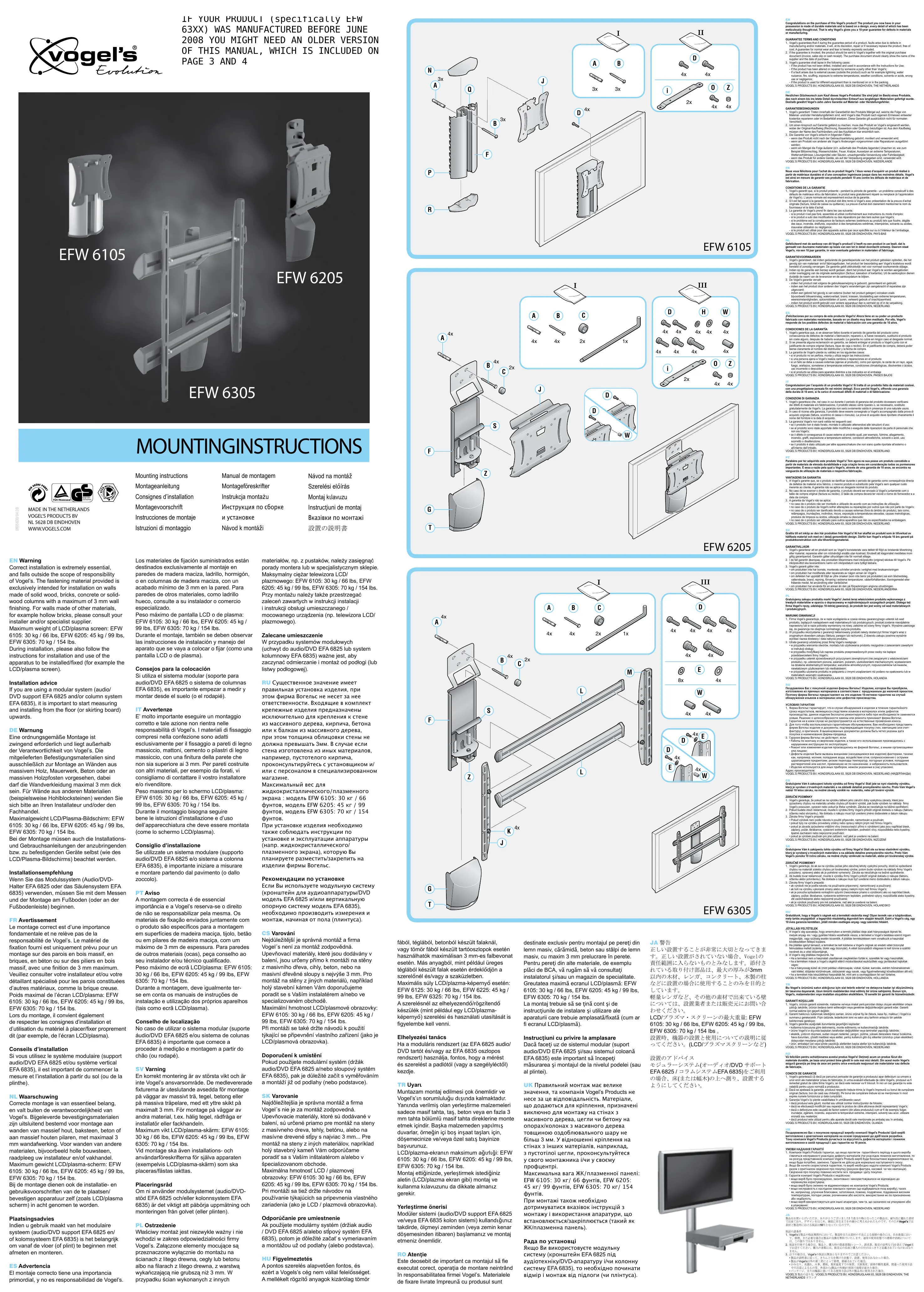 Le montage correct est d'une importance fondamentale et ne relève pas de la responsabilité de Vogel's. Le matériel de fixation fourni est uniquement prévu pour un montage sur des parois en bois massif, en briques, en béton ou sur des piliers en bois massif, avec une finition de 3 mm maximum. Veillez consulter votre installateur et/ou leur détaillant spécialisé pour les parois constituées d'autres matériaux, comme la brique creuse. Poids maximal de l'écran LCD/plasma: EFW 6105: 12 kg / 27 lbs, EFW 6205: 25 kg / 55 lbs, EFW 6305: 70 kg / 154 lbs.