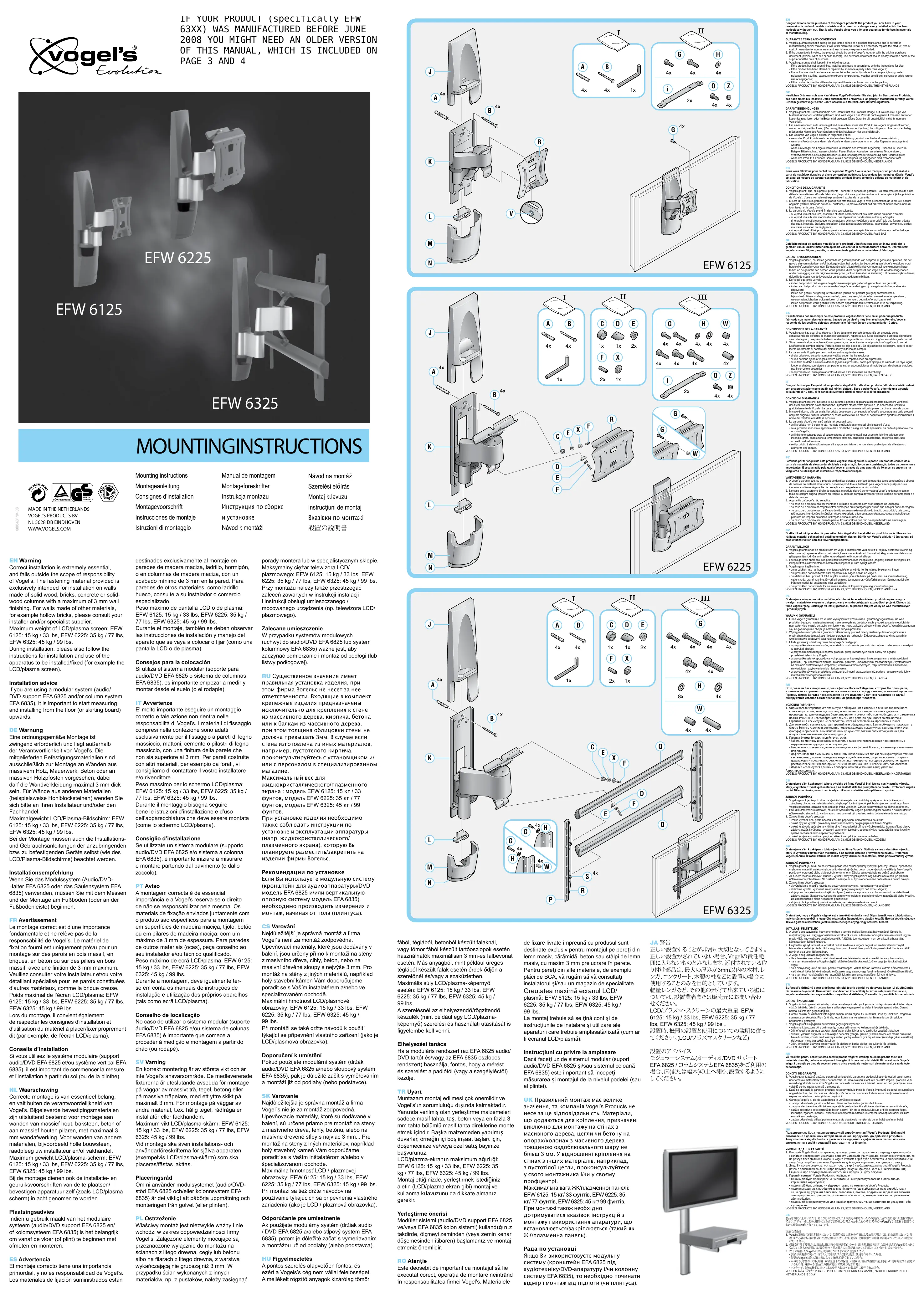 finamale et ne relieve pas de la responsabilité de Vogel's. Le matériel de fixation fourni est uniquement prevu pour un montage sur des parois en bois massif, en briques, en beton ou sur des piliers en bois massif, avec une finition de 3mm maximum. Veuilceur consulteruve installateur et/ou leur détaillant spécialise pour les parois constituitedes autres materiaux, comme la brique creuse. Poids maximal de 1'ecran LCD/plasma: EFW 6125: 12kg / 26 lbs, EFW 6225: 25kg / 55 lbs EFW 6325: 45kg / 96 lbs.