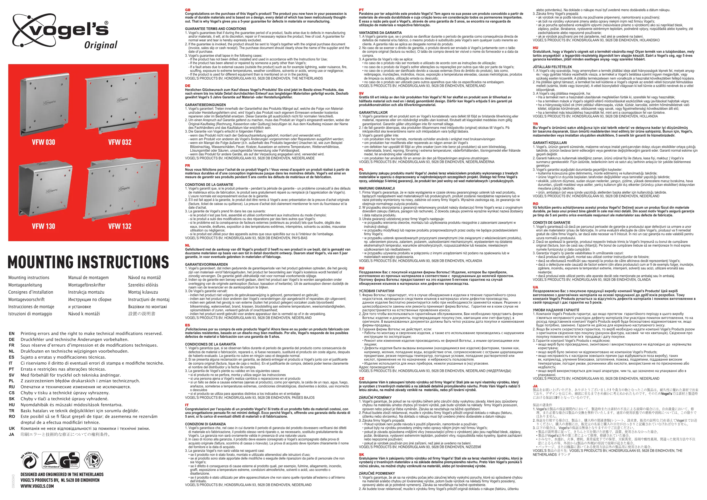 Nous vous félicitons pour l'achat de ce produit Vogel's ! Vous venez d'acquérir un produit réalisé à partir de matériaux durables et d'une conception ingénieuse jusque dans les moindres détails. Vogel est ainsi en mesure de garantir ses produits pendant 5 ans contre les défauts de matériaux et de fabrication.