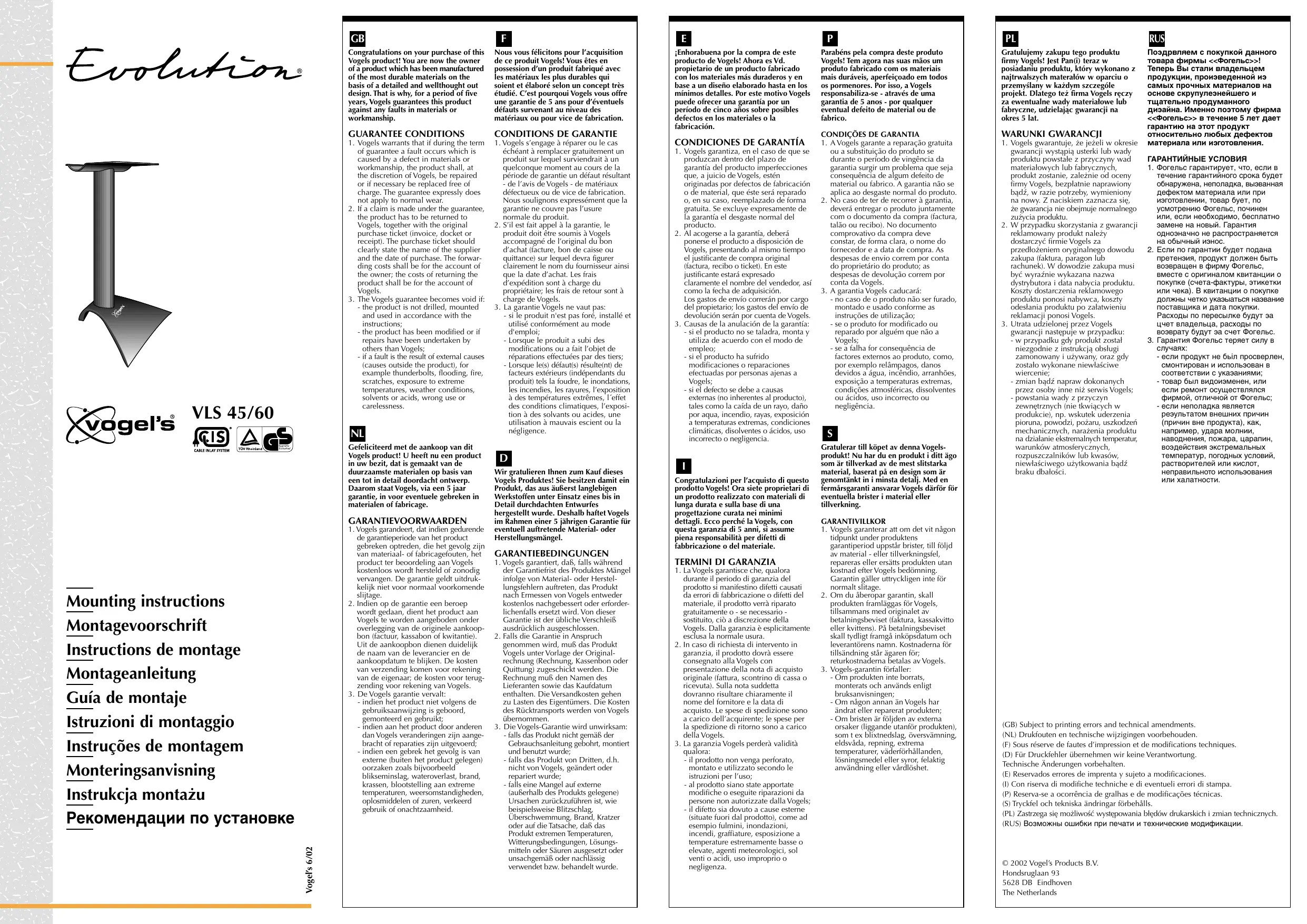 Nos you felicitons pour l'acquisition de ce produit Vogels! You est en possession d'un produit fabriqué avec les materiaux les plus durables qui soient etélaboré selon un concept très étudied. C'estpourquoi Vogels vous offre une garantie de 5 ans pour d'eventuels defaurs survenant au niveau des materiaux ou pour vice de fabrication.