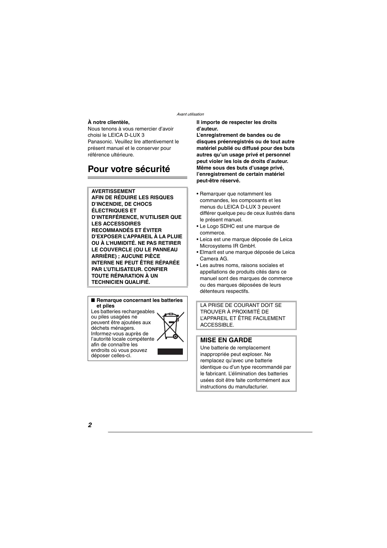 Il importe de respecter les droits d’auteur. L’enregistrement de bandes ou de disques préenregistrés ou de tout autre matériel publié ou diffusé pour des buts autres qu’un usage privé et personnel peut violer les lois de droits d’auteur. Même sous des buts d’usage privé, l’enregistrement de certain matériel peut-être réservé. • Remarquer que notamment les commandes, les composants et les menus du LEICA D-LUX 3 peuvent différer quelque peu de ceux ilustrés dans le présent manuel. • Le Logo SDHC est une marque de commerce. • Leica est une marque déposée de Leica Microsystems IR GmbH. • Elmarit est une marque déposée de Leica Camera AG. • Les autres noms, raisons sociales et appellations de produits cités dans ce manuel sont des marques de commerce ou des marques déposées de leurs détenteurs respectifs. LA PRISE DE COURANT DOIT SE TROUVER À PROXIMITÉ DE L’APPAREIL ET ÊTRE FACILEMENT ACCESSIBLE.