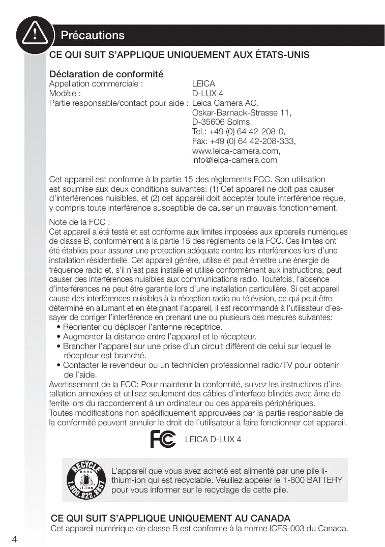 À) os CE QUI SUIT S'APPLIQUE UNIQUEMENT AUX ÉTATS-UNIS Déclaration de conformité Appellation commerciale : LEICA Modèle : D-LUX 4 Partie responsable/contact pour aide : Leica Camera AG, Oskar-Barnack-Strasse 11, D-35606 Solms, Tel.: +49 (0) 64 42-208-0, Fax: +49 (0) 64 42-208-333, www.leica-camera.com, info@leica-camera.com Cet appareil est conforme à la partie 15 des règlements FCC. Son utilisation est soumise aux deux conditions suivantes: (1) Cet appareil ne doit pas causer d'interférences nuisibles, et (2) cet appareil doit accepter toute interférence reçue, y compris toute interférence susceptible de causer un mauvais fonctionnement. Note de la FCC Cet apparel a été testé et est conforme aux limites imposées aux apparells numériques de classe B, conformément à la partie 15 des règlements de la FCC. Ces limites ont été établies pour assurer une protection adéquate contre les interférences lors d'une installation résidentielle. Cet appareil génère, utilise et peut émettre une énergie de fréquence radio et, s'il n'est pas installé et utilisé conformément aux instructions, peut causer des interférences nuisibles aux communications radio. Toutefois, l'absence d'interférences ne peut être garantie lors d'une installation particulière. Si cet appareil cause des interférences nuisibles à la réception radio ou télévision, ce qui peut être déterminé en allumant et en éteignant l'appareil, il est recommandé à l'utilisateur d'es- sayer de corriger l'interférence en prenant une ou plusieurs des mesures suivantes: + Réorienter ou déplacer l'antenne réceptrice. + Augmenter la distance entre l'appareil et le récepteur. + Brancher l'appareil sur une prise d'un circuit différent de celui sur lequel le récepteur est branché. + Contacter le revendeur ou un technicien professionnel radio/TV pour obtenir de l'aide. Avertissement de la FCC: Pour maintenir la conformité, suivez les instructions d'ins- tallation annexées et utilisez seulement des câbles d'interface blindés avec âme de ferrte lors du raccordement à un ordinateur ou des appareils périphériques. Toutes modifications non spécifiquement approuvées par la partie responsable de la conformité peuvent annuler le droit de l'utilisateur à faire fonctionner cet apparel LEICA D-LUX 4 M thium-ion qui est recyclable. Veuilez appeler le 1-800 BATTERY