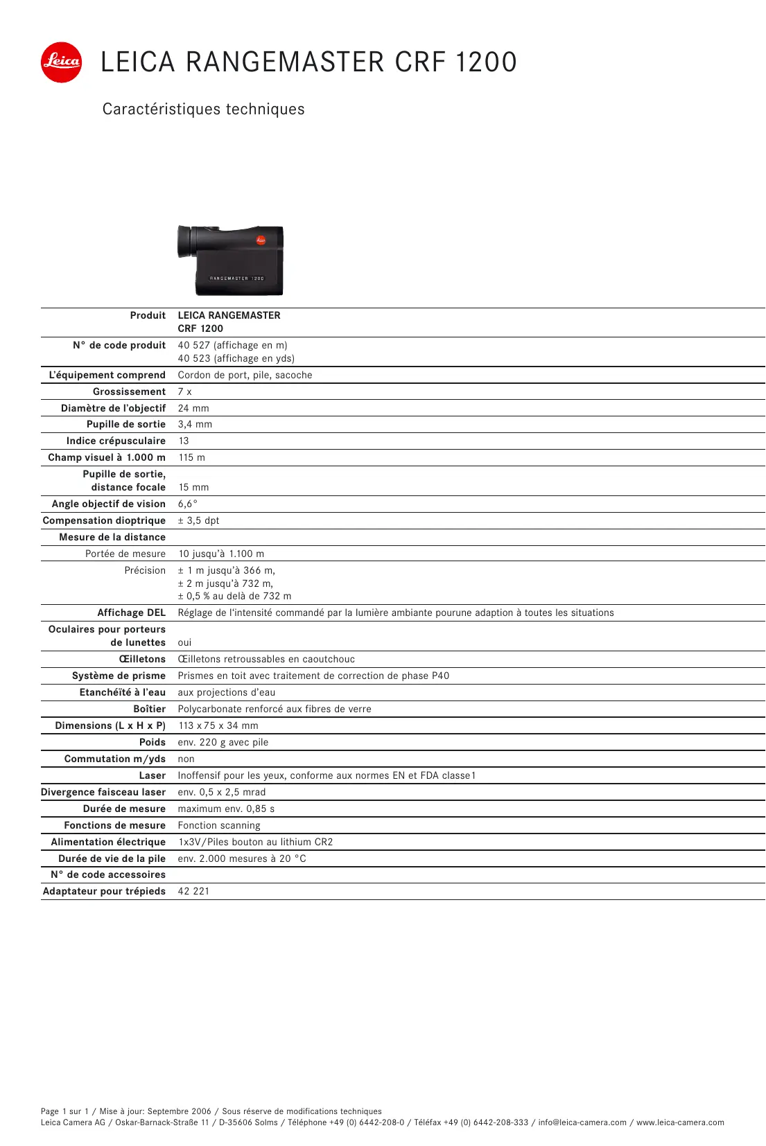 Page 1 sur 1 / Mise à jour: Septembre 2006 / Sous réserve de modifications techniques Leica Camera AG / Oskar-Barnack-Stra8e 11 / D-35606 Solms / Téléphone +49 (0) 6442-208-0 / Téléfax +49 (0) 6442-208-333 / info@leica-camera.com / wwwleica-camera.com