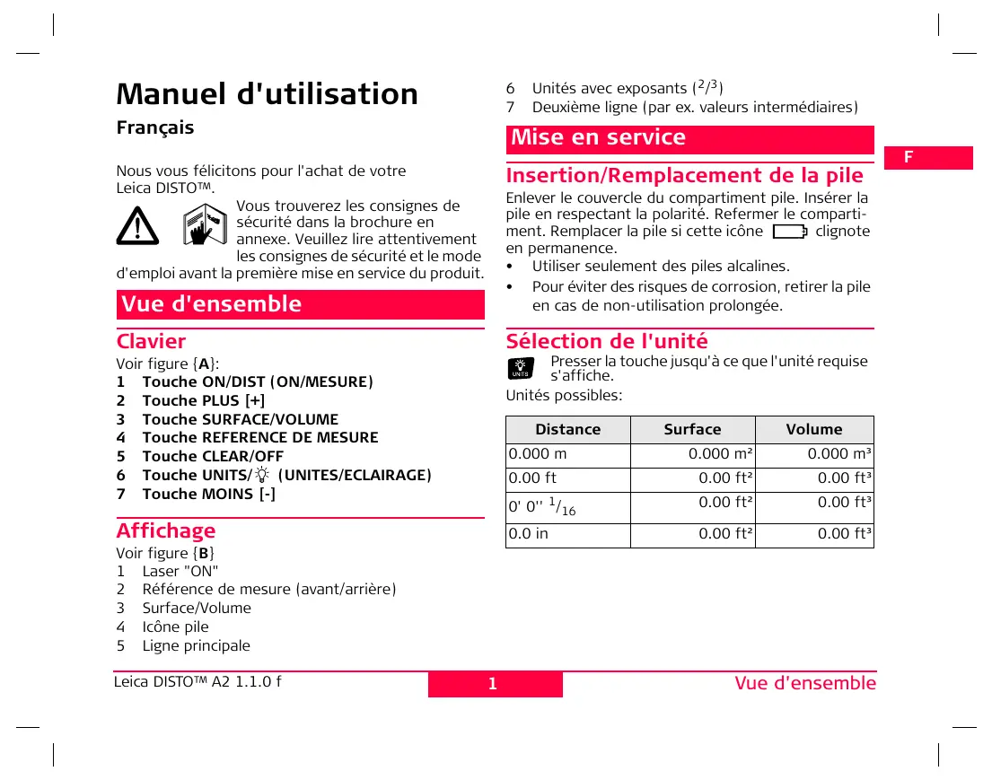 Nous vous félicitons pour l'achat de votre Leica DISTO™. Vous trouverez les consignes de sécurité dans la brochure en annexe. Veuillez lire attentivement les consignes de sécurité et le mode d'emploi avant la première mise en service du produit. Insertion/Remplacement de la pile Enlever le couvercle du compartiment pile. Insérer la pile en respectant la polarité. Refermer le compartiment. Remplacer la pile si cette icône clignote en permanence.