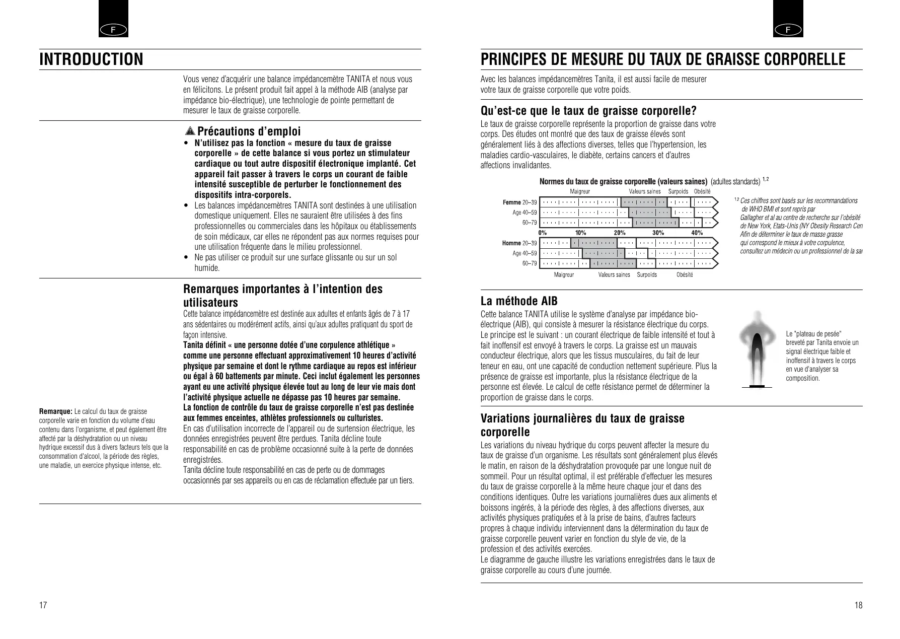 INTRODUCTION PRINCIPES DE MESURE DU TAUX DE GRAISSE CORPORELLE Vous venez d'acquérir une balance impédancemètre TANITA et nous vous en félicitons. Le présent produit fait appel à la méthode AIB (analyse par impédance bio-électrique), une technologie de pointe permettant de mesurer le taux de graisse corporelle. À Précautions d'emploi + N'utilisez pas la fonction « mesure du taux de graisse corporelle » de cette balance si vous portez un stimulateur cardiaque ou tout autre dispositif électronique implanté. Cet appareil fait passer à travers le corps un courant de faible inten: susceptible de perturber le fonctionnement des dispositifs intra-corporels. Les balances impédancemètres TANITA sont destinées à une utilisation domestique uniquement. Elles ne sauraient être utilisées à des fins professionnelles ou commerciales dans les hôpitaux ou établissements de soin médicaux, car elles ne répondent pas aux normes requises pour une utilisation fréquente dans le milieu professionnel Ne pas utiliser ce produit sur une surface glissante ou sur un sol humide. Remarque: Le calcul du taux de graisse corporelle varie en fonction du volume d'eau contenu dans l'organisme, et peut également être aitecté par la déshydratation ou un niveau hydrique excessi dus à divers facteurs tels que la consommation d'alcool, la période des règles une maladie, un exercice physique intense, ec. Remarques importantes à l'intention des utilisateurs Cette balance impédancemètre est destinée aux adultes et enfants âgés de 7 à 17 ans sédentaires ou modérément actifs, ainsi qu'aux adultes pratiquant du sport de façon intensive. Tanita définit « une personne dotée d’une corpulence athlétique » comme une personne effectuant approximativement 10 heures d’aci physique par semaine et dont le rythme cardiaque au repos est inférieur ou égal à 60 battements par minute. Ceci inclut également les personnes ayant eu une activité physique élevée tout au long de leur vie mais dont l'activité physique actuelle ne dépasse pas 10 heures par semaine. La fonction de contrôle du taux de graisse corporelle n'est pas destinée aux femmes enceintes, athlètes professionnels ou culturistes. En cas d'utilisation incorrecte de l'appareil ou de surtension électrique, les données enregistrées peuvent être perdues. Tanita décline toute responsabilité en cas de problème occasionné suite à la perte de données enregistrées. Tanita décline toute responsabilité en cas de perte ou de dommages occasionnés par ses appareils ou en cas de réclamation effectuée par un tiers. Avec les balances impédancemètres Tanita, il est aussi facile de mesurer votre taux de graisse corporelle que votre poids. Qu'est-ce que le taux de graisse corporelle? Le taux de graisse corporelle représente la proportion de graisse dans votre corps. Des études ont montré que des taux de graisse élevés sont généralement liés à des affections diverses, telles que l'hypertension, les maladies cardio-vasculaires, le diabète, certains cancers et d'autres affections invalidantes. Normes du taux de graisse corporelle (valeurs saines) (adultes standards) *? Magrur Supoiés Obésité Femme FT TEE ff Os és amd « son repris par en D : LL ble Gallagher la au centre de recherche sur l'obésité ? de Heu York, ls-Unis (NY Obesly Research Cen Go fn de déterminer aux de mass grasse Homme 20-33 ui carespondle mieux à vote copuiece, re corsulez un médecin ou un proesionnel de la sa œn[ Obésité La méthode AIB Cette balance TANITA utilise le système d'analyse par impédance bio- électrique (AIB), qui consiste à mesurer la résistance électrique du corps. Le principe est le suivant : un courant électrique de faible intensité et tout à fait inoffensif est envoyé à travers le corps. La graisse est un mauvais conducteur électrique, alors que les tissus musculaires, du fait de leur à à : inoffensif à travers Le corps teneur en eau, ont une capacité de conduction nettement supérieure. Plus la en vue d'analyser sa présence de graisse est importante, plus la résistance électrique de la composition. personne est élevée. Le calcul de cette résistance permet de déterminer la ——— proportion de graisse dans le corps. Le plateau de pesée" breveté par Tanita envoie un signal électrique faible et Variations journalières du taux de graisse corporelle Les variations du niveau hydrique du corps peuvent affecter la mesure du taux de graisse d'un organisme. Les résultats sont généralement plus élevés le matin, en raison de la déshydratation provoquée par une longue nuit de sommeil. Pour un résultat optimal, il est préférable d'effectuer les mesures du taux de graisse corporelle à la même heure chaque jour et dans des conditions identiques. Outre les variations journalières dues aux aliments et boissons ingérés, à la période des règles, à des affections diverses, aux activités physiques pratiquées et à la prise de bains, d'autres facteurs propres à chaque individu interviennent dans la détermination du taux de graisse corporelle peuvent varier en fonction du style de vie, de la profession et des activités exercées. Le diagramme de gauche illustre les variations enregistrées dans le taux de graisse corporelle au cours d'une journée.