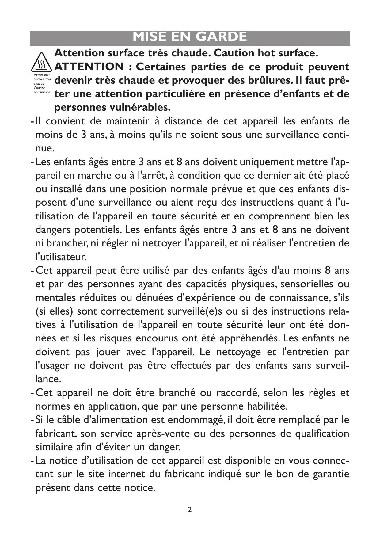 Attention surface très chaude. Caution hot surface.