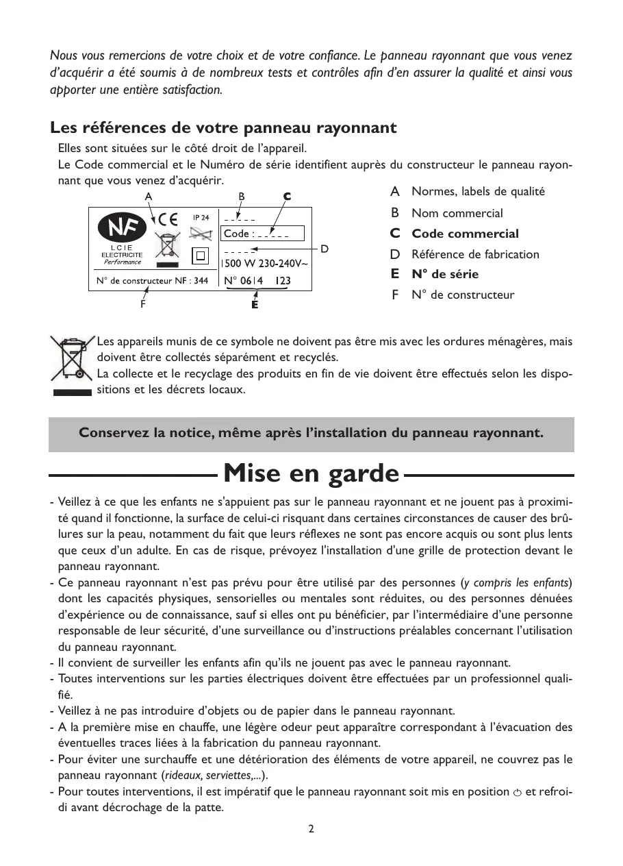 Le Code commercial et le Numéro de série identifient auprès du constructeur le panneau rayonnant que vous venez d’acquérir. A Normes, labels de qualité