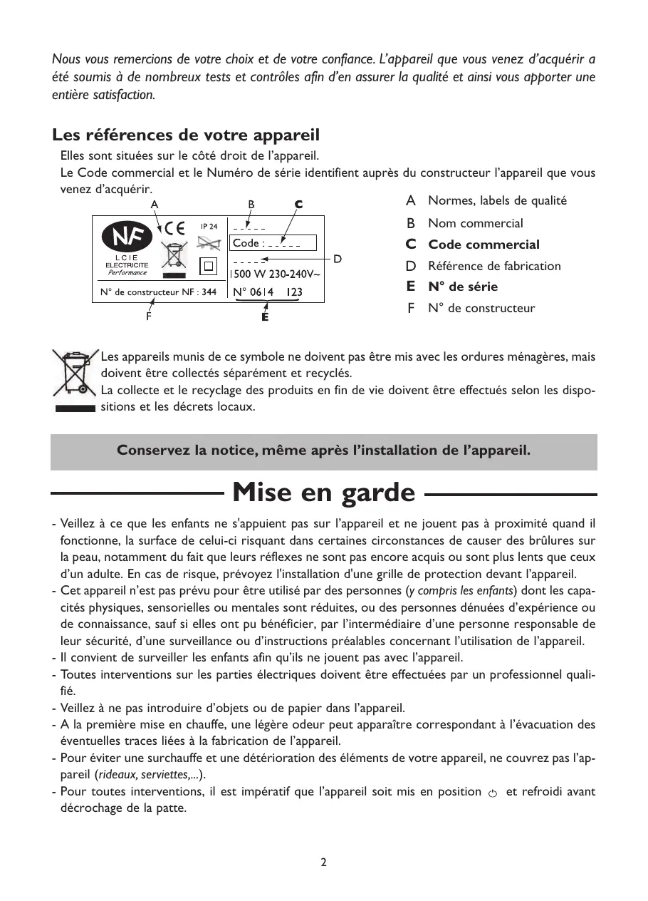 Conservez la notice, même après l'installation de l'appareil.