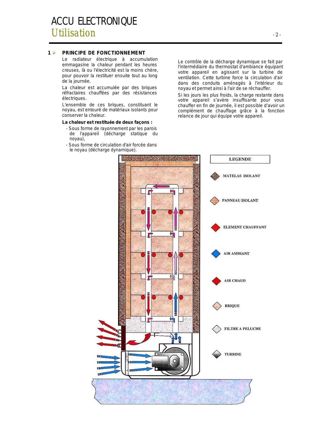 PRINCIPE DE FONCTIONNEMENT Le radiateur électrique à accumulation emmagasine la chaleur pendant les heures creuses, là ou l'électricité est la moins chère, pour pouvoir la restituer ensuite tout au long de la journée. La chaleur est accumulée par des briques réfractaires chauffées par des résistances électriques. L'ensemble de ces briques, constituant le noyau, est entouré de matériaux isolants pour conserver la chaleur. La chaleur est restituée de deux façons : - Sous forme de rayonnement par les parois de l'appareil (décharge statique du noyau), - Sous forme de circulation d'air forcée dans le noyau (décharge dynamique).