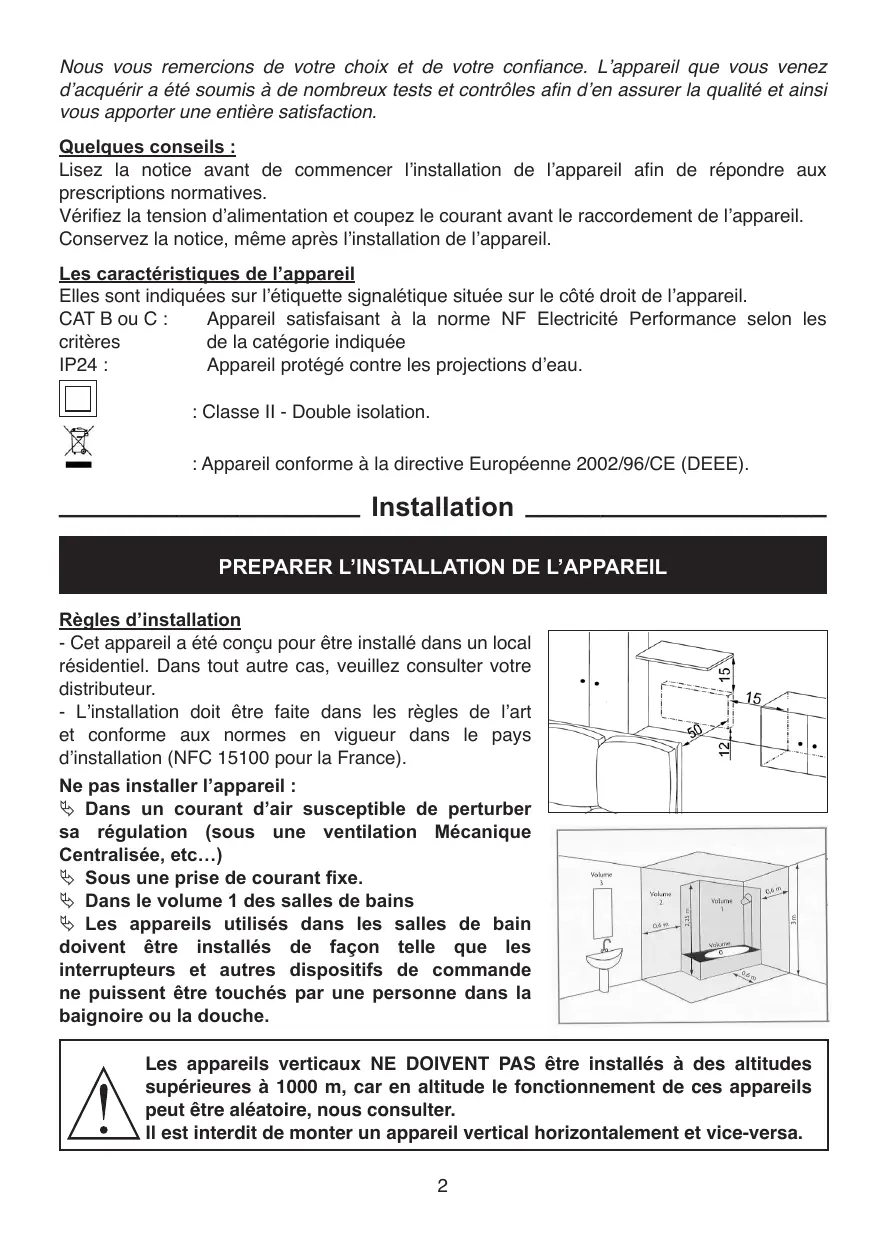 Les appareils verticaux NE DOIVENT PAS être installés à des altitudes supérieures à 1000 m, car en altitude le fonctionnement de ces appareils peut être aléatoire, nous consulter.