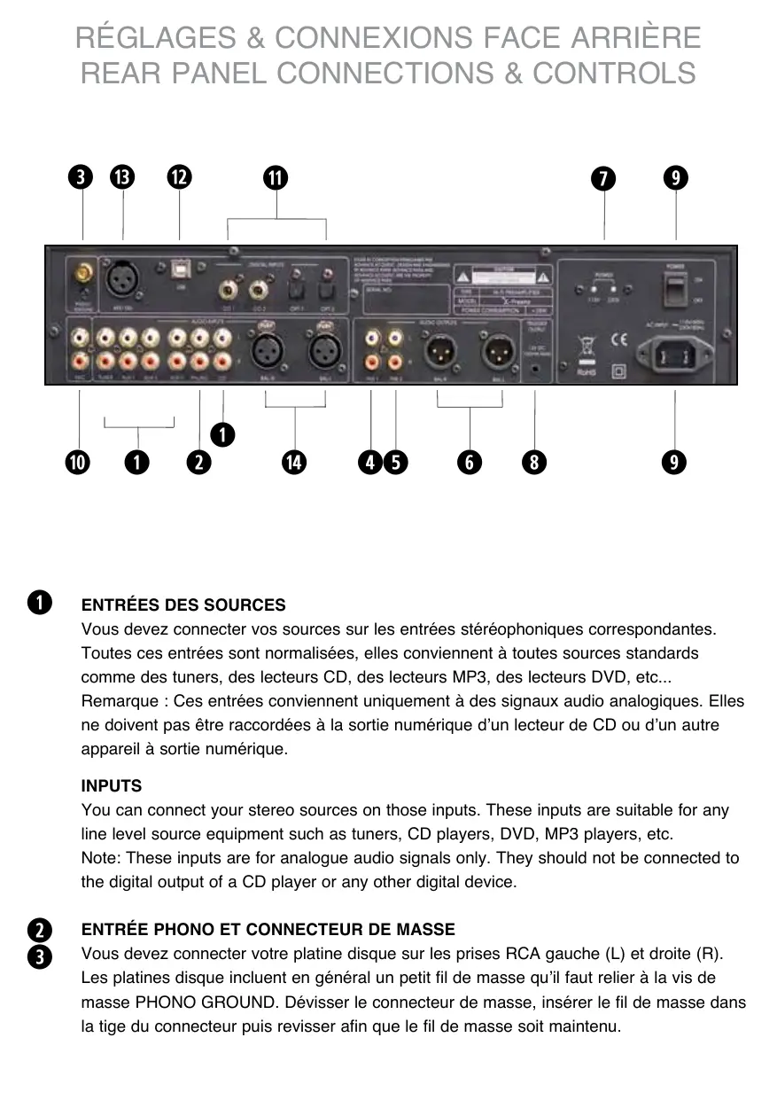 Voudevez connecter vos sources sur les entrées stéréophoniques correspondantes. Toutes ces entrées sont normalisées, elles convennnt à toutes sources standards comme des tuners, des lecteurs CD, des lecteurs MP3, des lecteurs DVD, etc...
