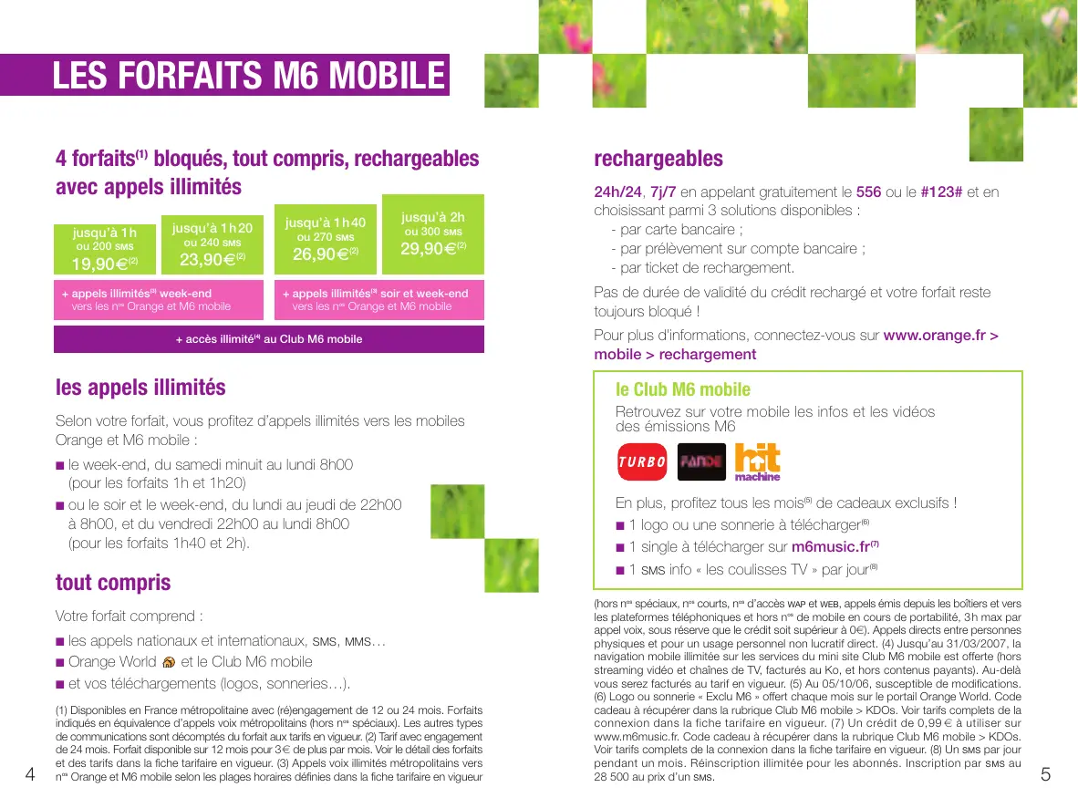(1) Disponibles en France métropolitaire avec (ré)engagement de 12 ou 24 mois. Foraits indiqués en équivalence d'appels voix métropolitains (hors n^as spéciaux). Les autres types de communications sont décomptés du fortain aux tarifs en vigueur. (2) Tarif avec engagement de 24 mois. Forfait disponible sur 12 mois pour 3 € de plus par mois. Voir le détaïl des foraits et des tarifs dans la fiche tarifique en vigueur. (3) Appels voix illimités métropolitains vers n^as Orange et M6 mobile selon les plages horaires définies dans la fiche tariffe en vigueur