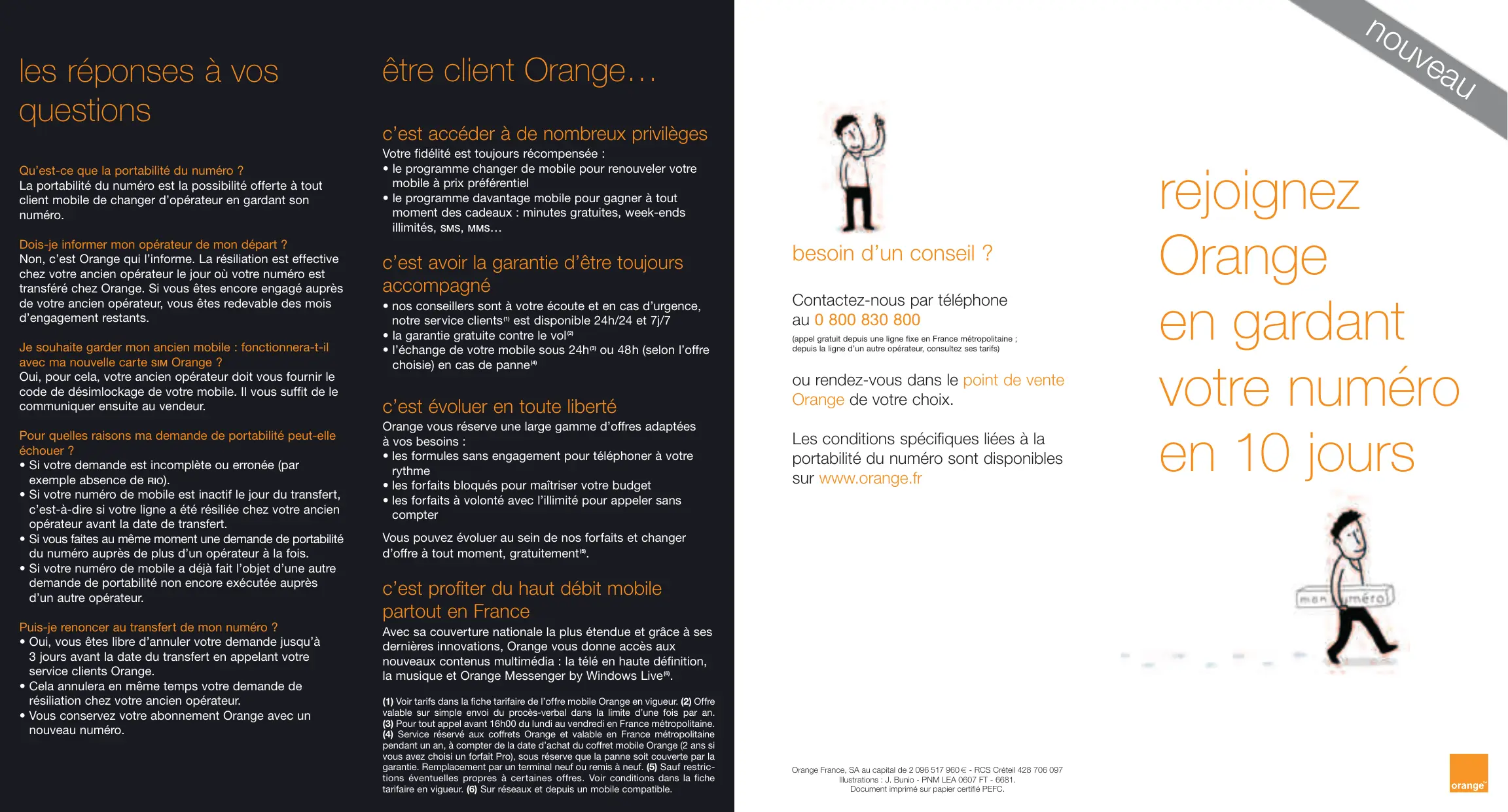les réponses à vos questions Qu'est-ce que la portabilité du numéro ? La portabilité du numéro est la possibilité offerte à tout client mobile de changer d'opérateur en gardant son numéro. Dois-je informer mon opérateur de mon départ ? Non, c'est Orange qui l’informe. La résiliation est effective chez votre ancien opérateur le jour où votre numéro est transféré chez Orange. Si vous êtes encore engagé auprès de votre ancien opérateur, vous êtes redevable des mois d'engagement restants. Je souhaïite garder mon ancien mobile : fonctionnera-t-il avec ma nouvelle carte sim Orange ? Oui, pour cela, votre ancien opérateur doit vous fournir le code de désimlockage de votre mobile. Il vous suffit de le communiquer ensuite au vendeur. Pour quelles raisons ma demande de portabilité peut-elle échouer ? + Si votre demande est incomplète ou erronée (par exemple absence de Rio). + Si votre numéro de mobile est inactif le jour du transfer! c'est-à-dire si votre ligne a été résiliée chez votre ancien opérateur avant la date de transfert. + Si vous faites au même moment une demande de portabilité du numéro auprès de plus d’un opérateur à la fois. + Si votre numéro de mobile a déjà fait l’objet d'une autre demande de portabilité non encore exécutée auprès d’un autre opérateur. Puis-je renoncer au transfert de mon numéro ? + Oui, vous êtes libre d'annuler votre demande jusqu’à 3 jours avant la date du transfert en appelant votre service clients Orange. + Cela annulera en même temps votre demande de résiliation chez votre ancien opérateur. + Vous conservez votre abonnement Orange avec un nouveau numéro. être client Orange. c'est accéder à de nombreux privilèges Votre fidélité est toujours récompensée : + le programme changer de mobile pour renouveler votre mobile à prix préférentiel + le programme davantage mobile pour gagner à tout moment des cadeaux : minutes gratuites, week-ends illimités, SMS, MMS. c’est avoir la garantie d’être toujours accompagné + nos conseillers sont à votre écoute et en cas d'urgence, notre service clients! est disponible 24h/24 et 7j/7 + la garantie gratuite contre le vol + l'échange de votre mobile sous 24h° où 48h (selon l'offre choisie) en cas de panne“ c’est évoluer en toute liberté Orange vous réserve une large gamme d'offres adaptées à vos besoins : - les formules sans engagement pour téléphoner à votre rythme - les forfaits bloqués pour maîtriser votre budget - les forfaits à volonté avec l'illimité pour appeler sans compter Vous pouvez évoluer au sein de nos forfaits et changer d'offre à tout moment, gratuitement®. c’est profiter du haut débit mobile partout en France Avec sa couverture nationale la plus étendue et grâce à ses dernières innovations, Orange vous donne accès aux nouveaux contenus multimédia : la télé en haute définition, la musique et Orange Messenger by Windows Live”.