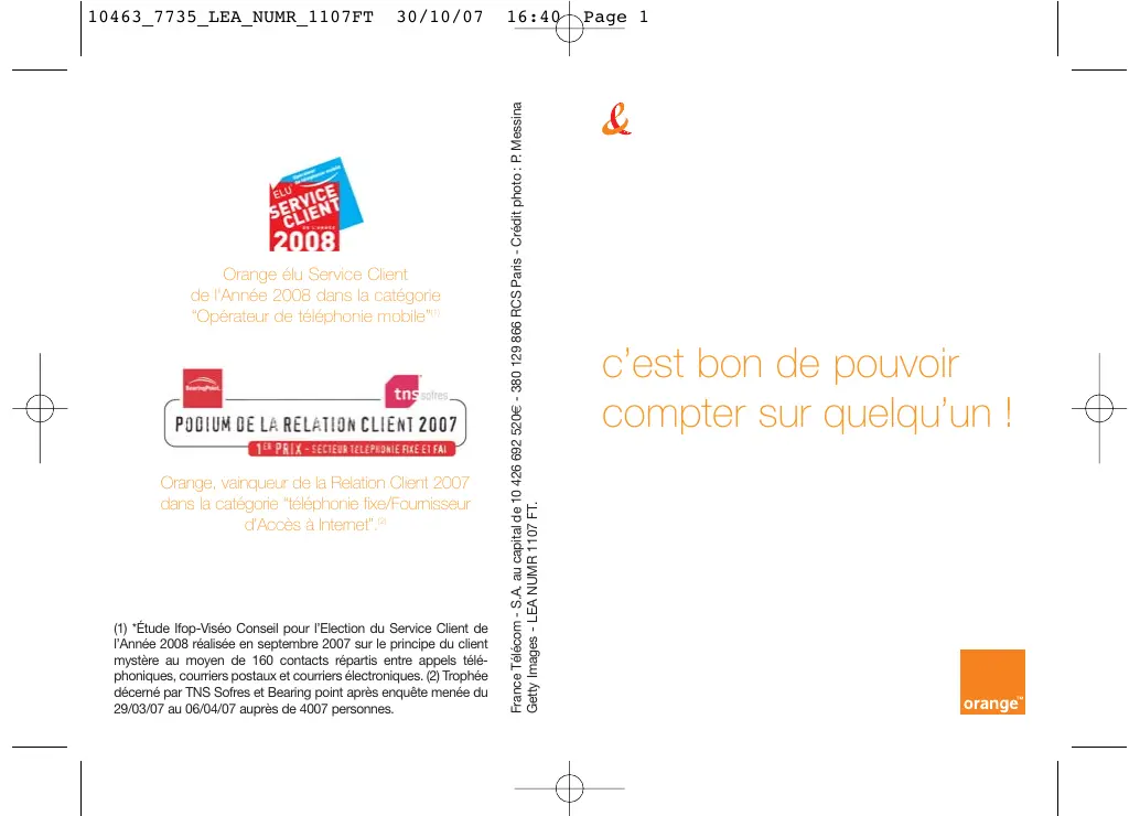 30/10/07 Orange élu Service Client de l'Année 2008 dans la catégorie “Opérateur de téléphonie mobile”(1) Orange, vainqueur de la Relation Client 2007 dans la catégorie “téléphonie fixe/Fournisseur d’Accès à Internet”.(2) (1) *Étude Ifop-Viséo Conseil pour l’Election du Service Client de l’Année 2008 réalisée en septembre 2007 sur le principe du client mystère au moyen de 160 contacts répartis entre appels téléphoniques, courriers postaux et courriers électroniques. (2) Trophée décerné par TNS Sofres et Bearing point après enquête menée du 29/03/07 au 06/04/07 auprès de 4007 personnes. 16:40 France Télécom - S.A. au capital de 10 426 692 520€ - 380 129 866 RCS Paris - Crédit photo : P. Messina Getty Images - LEA NUMR 1107 FT.
