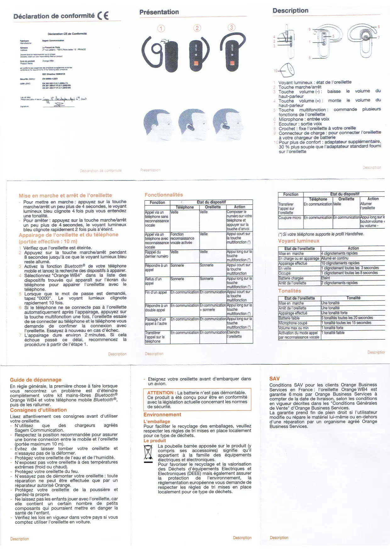 WB4 - Oreillette Bluetooth ORANGE - Notice d'utilisation et mode d'emploi gratuit