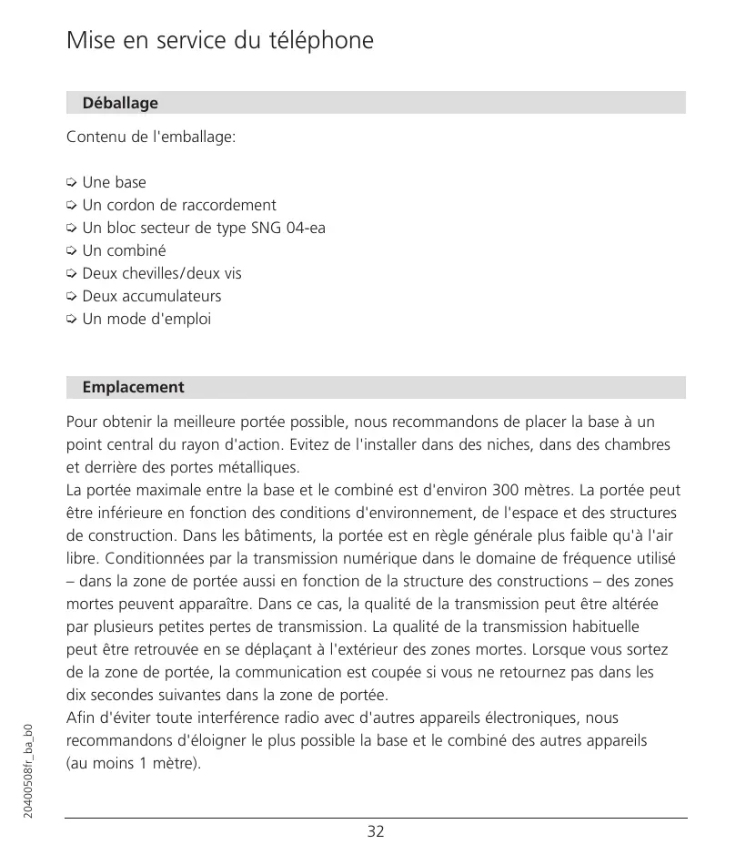 La portée maximale entre la base et le combiné est d'environ 300 mètres. La portée peut être inférieure en fonction des conditions d'environnement, de l'espace et des structures de construction. Dans les bâtiments, la portée est en règle générale plus faible qu'à l'air libre. Conditionnées par la transmission numérique dans le domaine de fréquence utilisé — dans la zone de portée aussi en fonction de la structure des constructions - des zones mortes peuvent apparaître. Dans ce cas, la qualité de la transmission peut être altérée par plusieurs petites pertes de transmission. La qualité de la transmission habituelle