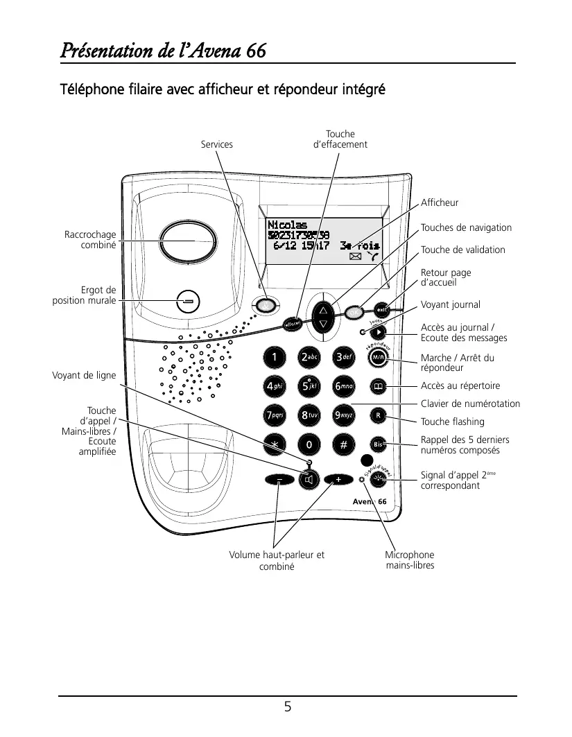 Présentation de l'Avena 66 Téléphone filaire avec afficheur et répondeur intégré Touche Services d'effacement Afficheur Touches de navigation Raccrochage " get combiné | T ) Touche de validation Retour page d'accueil Ergot de position murale Voyant journal Accès au journal / Ecoute des messages l__ Marche / Arrêt du répondeur Voyant de ligne tes 1— Accès au répertoire —— Clavier de numérotation Touche d'appel / [— Touche flashing Mains-lbres / Ecoute |__ Rappel des 5 derniers amplifiée numéros composés | __ Signal d'appel 2e" correspondant Volume haut-parleur et Microphone combiné mains libres