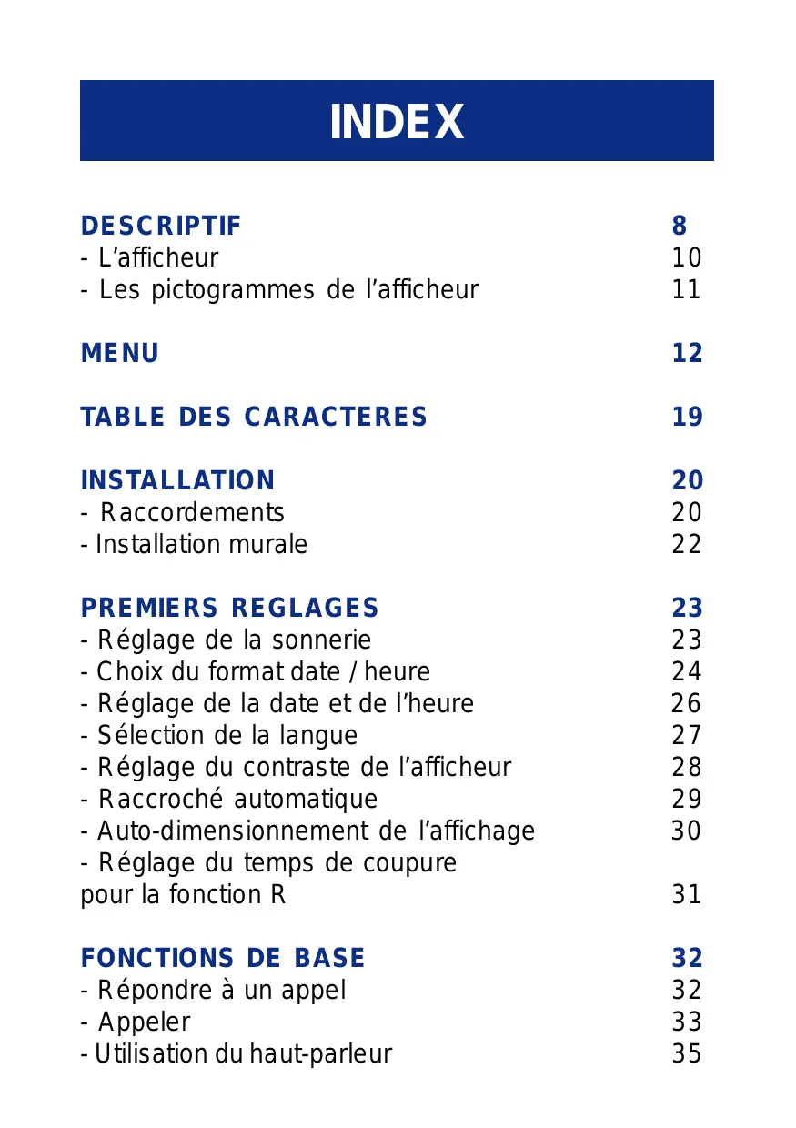 - Réglage du contraste de l'afficheur 28 - Raccroché automatique 29