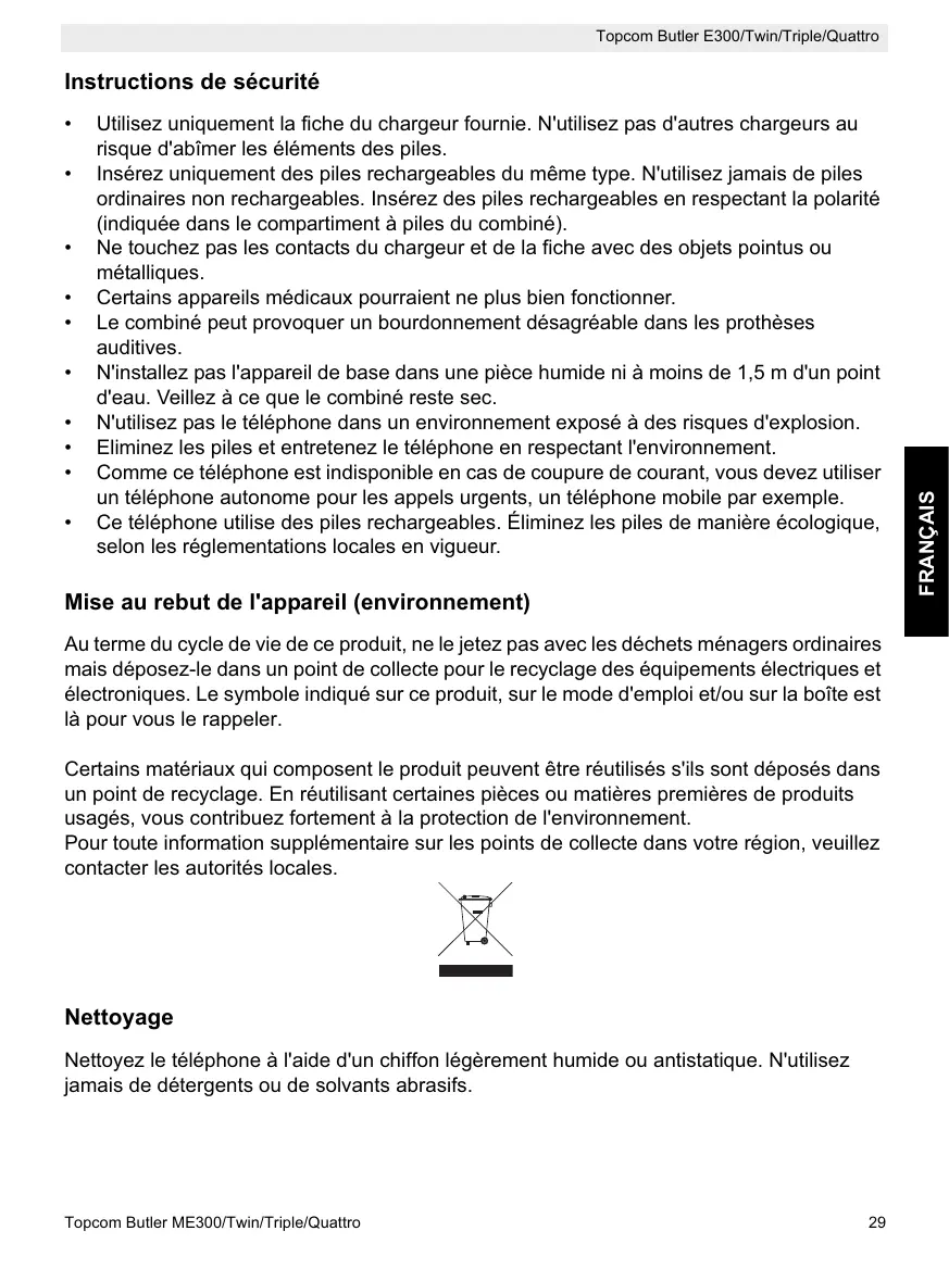Insérez uniquement des piles rechargeables du même type. N'utilisez jamais de piles ordinaires non rechargeables. Insérez des piles rechargeables en respectant la polarité (indiquée dans le compartiment à piles du combiné). Ne touchez pas les contacts du chargeur et de la fiche avec des objets pointus ou métalliques. Certains appareils médicaux pourraient ne plus bien fonctionner. Le combiné peut provoquer un bourdonnement désagréable dans les prothèses auditives. N'installez pas l'appareil de base dans une pièce humide ni à moins de 1,5 m d'un point d'eau. Veillez à ce que le combiné reste sec. N'utilisez pas le téléphone dans un environnement exposé à des risques d'explosion. Eliminez les piles et entretenez le téléphone en respectant l'environnement. Comme ce téléphone est indisponible en cas de coupure de courant, vous devez utiliser un téléphone autonome pour les appels urgents, un téléphone mobile par exemple. Ce téléphone utilise des piles rechargeables. Éliminez les piles de manière écologique, selon les réglementations locales en vigueur.