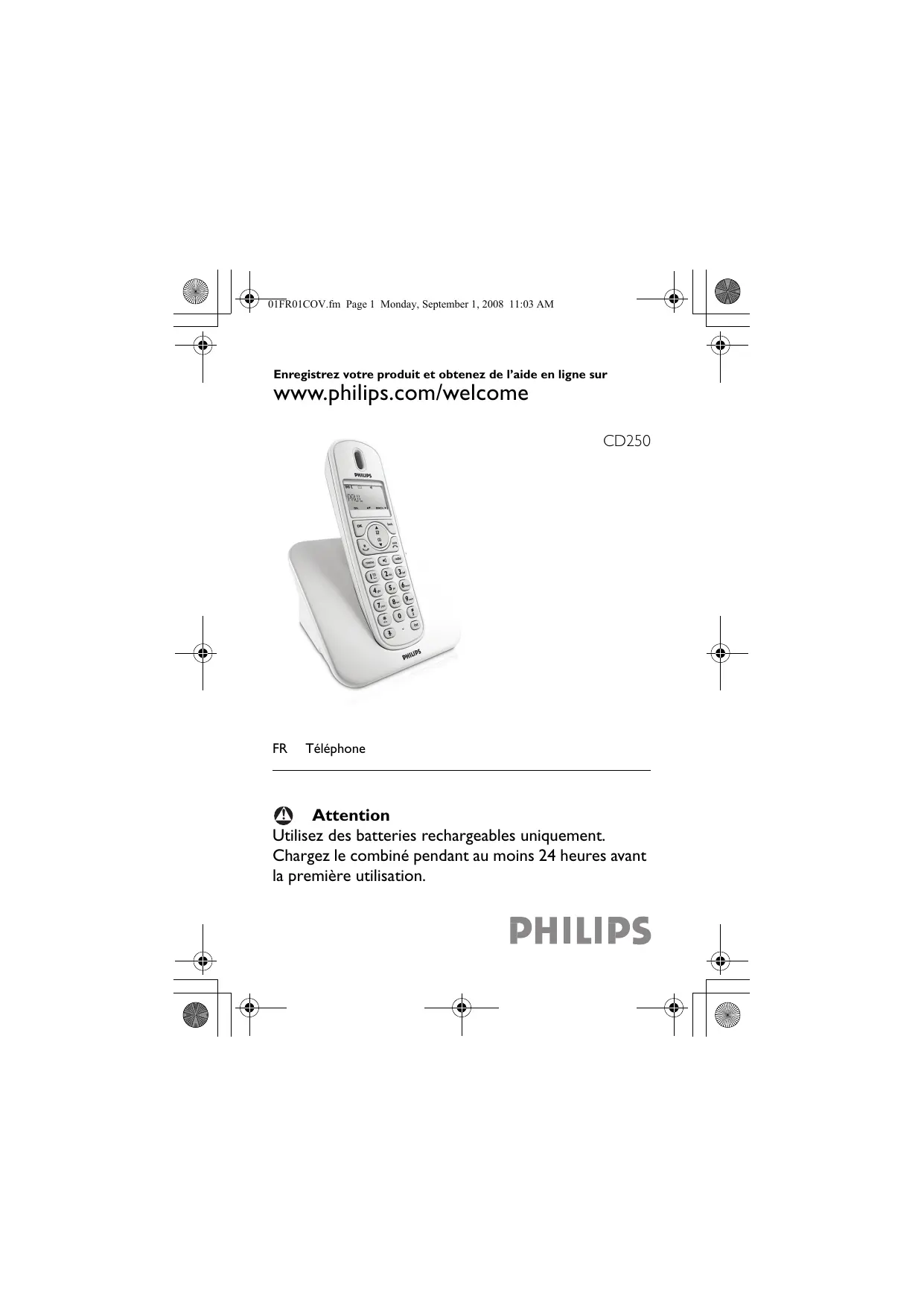 à & 4 l PT TIFROICOV.fm Page 1 Monday, September 1, 2008 11:03 AM SA Ï Enregistrez votre produit et obtenez de l’aide en ligne sur www.philips.com/welcome CD250 {de dei @ &7 FR Téléphone D Attention Utilisez des batteries rechargeables uniquement. Chargez le combiné pendant au moins 24 heures avant la première utilisation. j PS