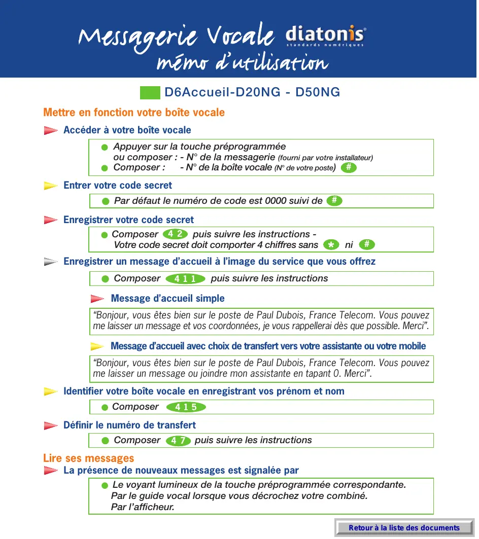 Appuyer sur la touche préprogrammée ou composer le N° de la messagerie (fourni par votre installateur) Composer : N° de la boîte vocale (N° de votre poste) # - Code secret suivi de # Écouter vos messages 1