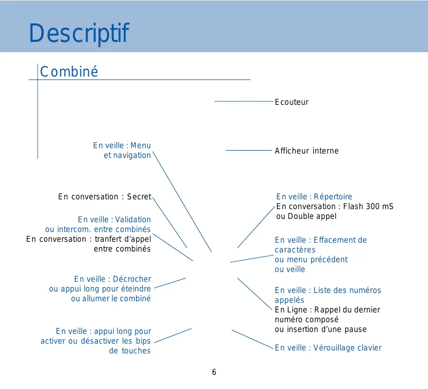 [Combiné ————— Ecouteur En veille : Menu et navigation ——— Afficheur interne En conversation : Secret. En veille : Répertoire En conversation : Flash 300 mS En veille : Validation ou Double appel ou intercom. entre combinés En conversation : tranfert d'appel En veille : Effacement de entre combinés caractères TT où menu précédent ou veille En veille : Décrocher Qu appui long pour éteindre TT En veille : Liste des numéros ou allumer le combin appelés En Ligne : Rappel du dernier numéro composé En veille : appui long pour ou insertion d'une pause activer ou désactiver les bips TT LC de touches En veille : Vérouillage clavier