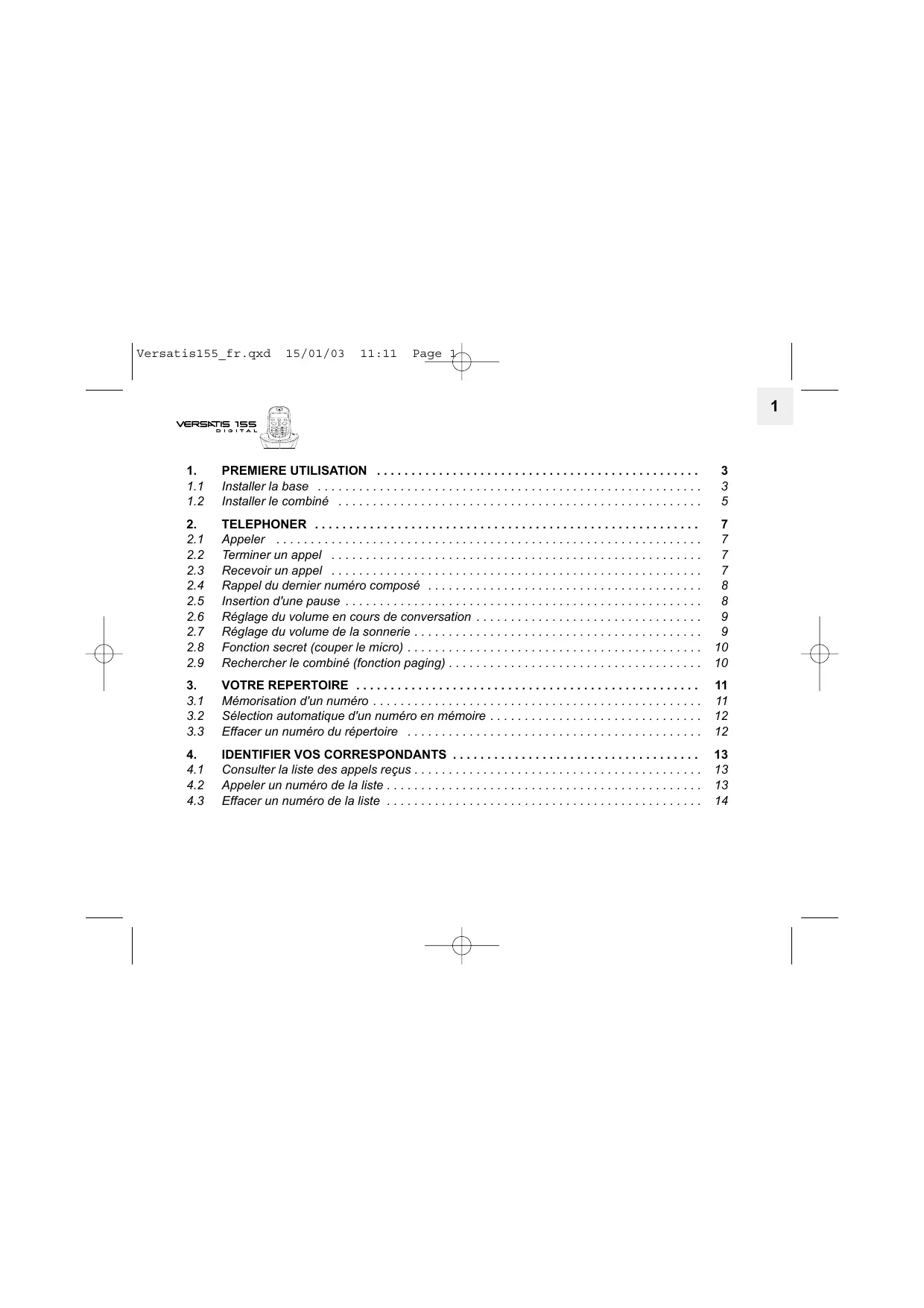 Versatis155 fr.qxd 15/01/03 11:11 Page Jh D — TELEPHONER Appeler . Terminer un appel .… Recevoir un appel . Rappel du dernier numéro composé. Insertion d'une pause . Réglage du volume en cours de conversation . Réglage du volume de la sonnerie Fonction secret (couper le micro) Rechercher le combiné (fonction paging) VOTRE REPERTOIRE .… Mémorisation d'un numéro . . Sélection automatique d'un numéro en mémoire . Effacer un numéro du répertoire
