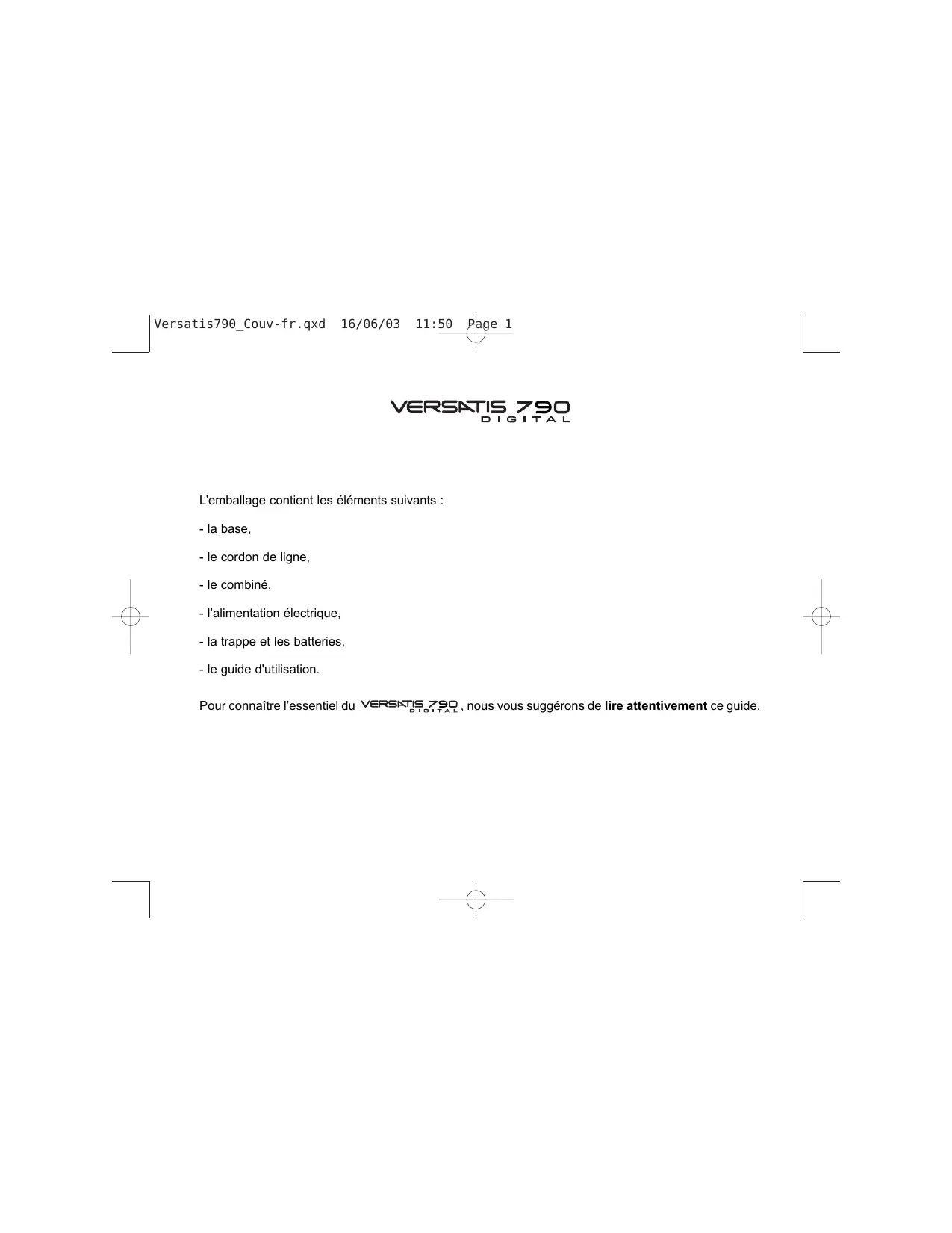 Versatis790 Couv-fr.qxd 16/06/03 11:50 pe VERSATIS 790 GITAL L'emballage contient les éléments suivants : - la base, - le cordon de ligne, - le combiné, - l'alimentation électrique, - la trappe et les batteries, - le guide d'utilisation. Pour connaître l'essentiel du VERSXTIS.720, nous vous suggérons de lire attentivement ce guide.