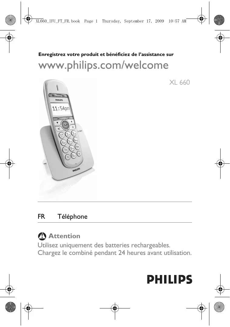 Enregistrez votre produit et bénéficiez de l'assistance sur www.philips.com/welcome XL 660 FR Téléphone © Attention Utilisez uniquement des batteries rechargeables. Chargez le combiné pendant 24 heures avant utilisation. PHILIPS & H— + + el+—