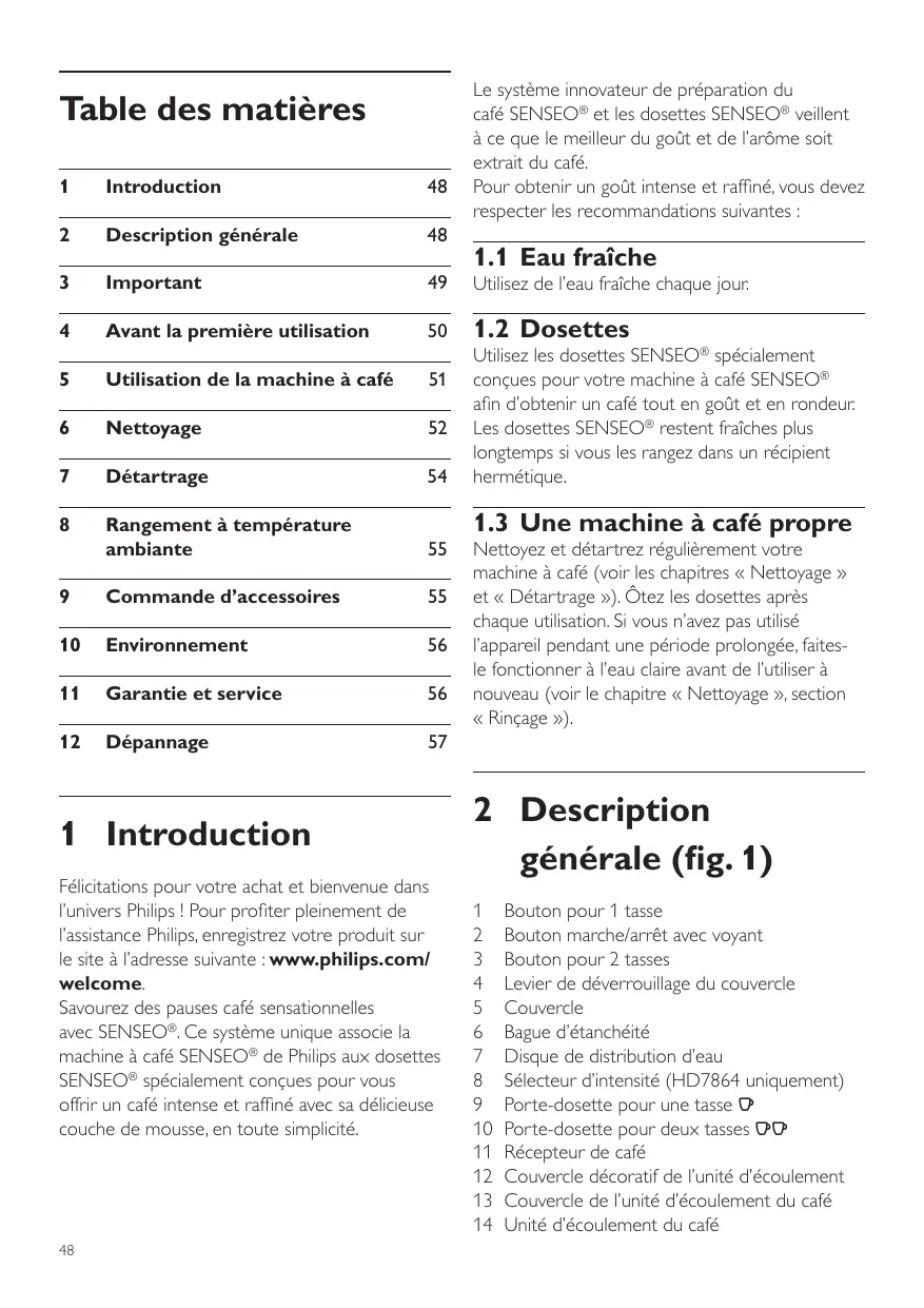 Table des matières Le système innovateur de préparation du café SENSEO® et les dosettes SENSEO® veillent à ce que le meilleur du goût et de l'arôme soit extrait du café 1 Introduction 48 Pour obtenir un goût intense et raffiné, vous devez respecter les recommandations suivantes 2 Description générale 48