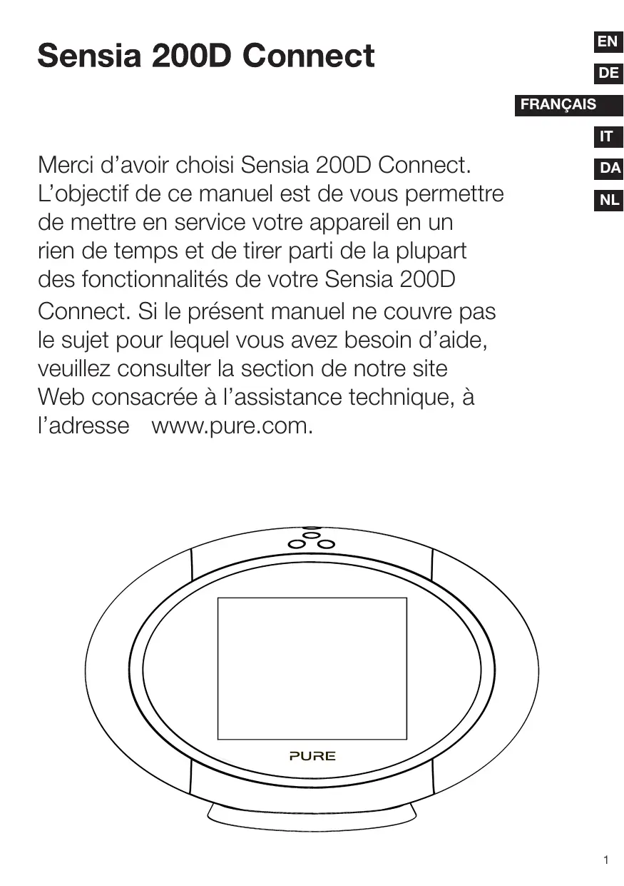 Merci d’avoir choisi Sensia 200D Connect. L’objectif de ce manuel est de vous permettre de mettre en service votre appareil en un rien de temps et de tirer parti de la plupart des fonctionnalités de votre Sensia 200D Connect. Si le présent manuel ne couvre pas le sujet pour lequel vous avez besoin d’aide, veuillez consulter la section de notre site Web consacrée à l’assistance technique, à l’adresse www.pure.com.