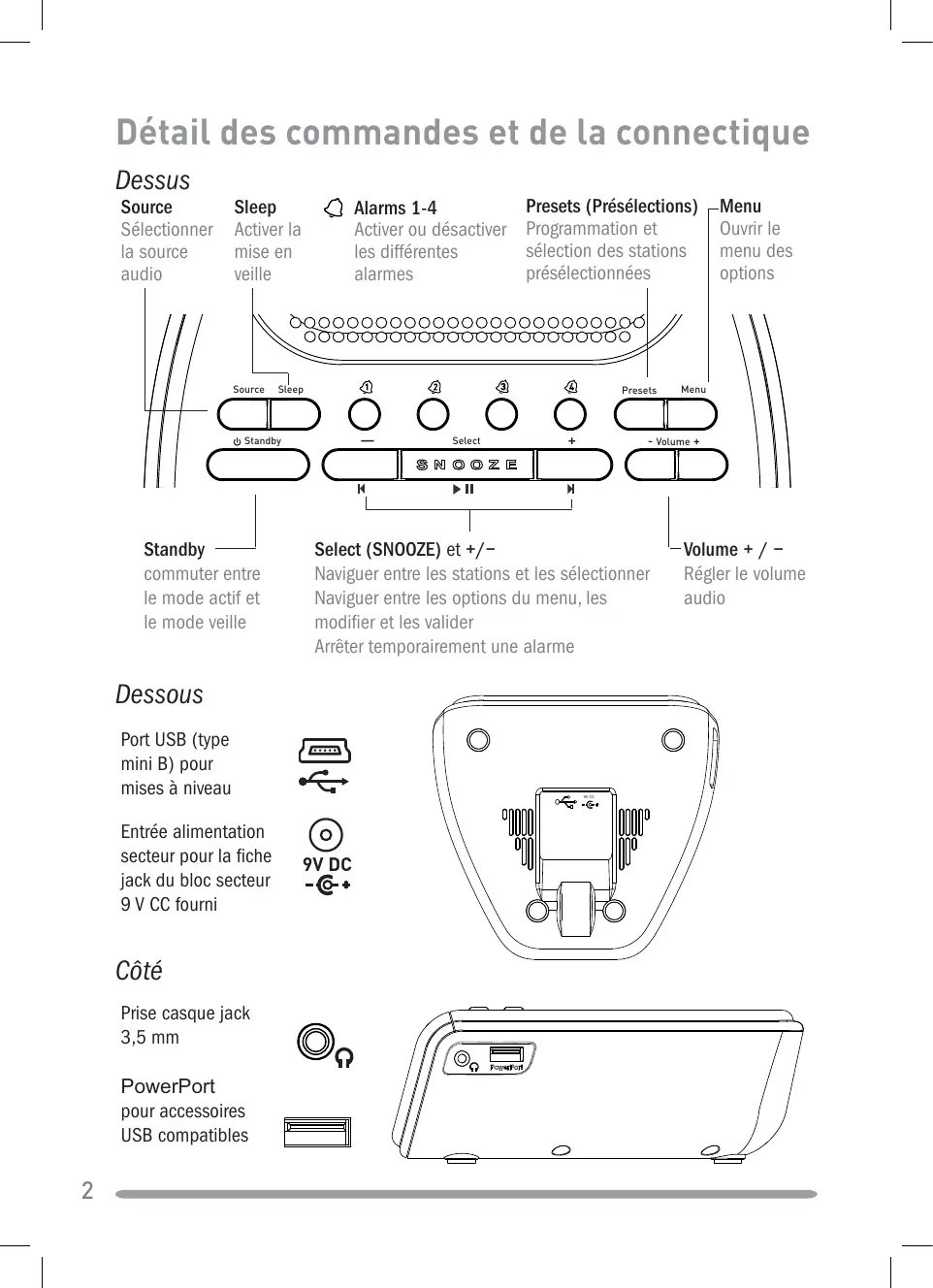 Dessous Entrée alimentation secteur pour la fiche jack du bloc secteur 9 V CC fourni Côté Prise casque jack 3,5 mm PowerPort pour accessoires USB compatibles